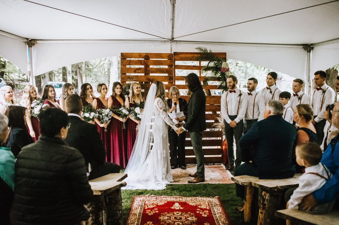 The bride and groom at this wedding chose to celebrate at Farm Table Inn Lake Cowichan. The ceremony took place under a transparent tent with a palette backdrop and vintage rugs. The floral was grown by their families and created a garden feeling at both the ceremony and reception. Taper candles, live floral edges and vintage touches in every corner showcase the couple’s tastes.