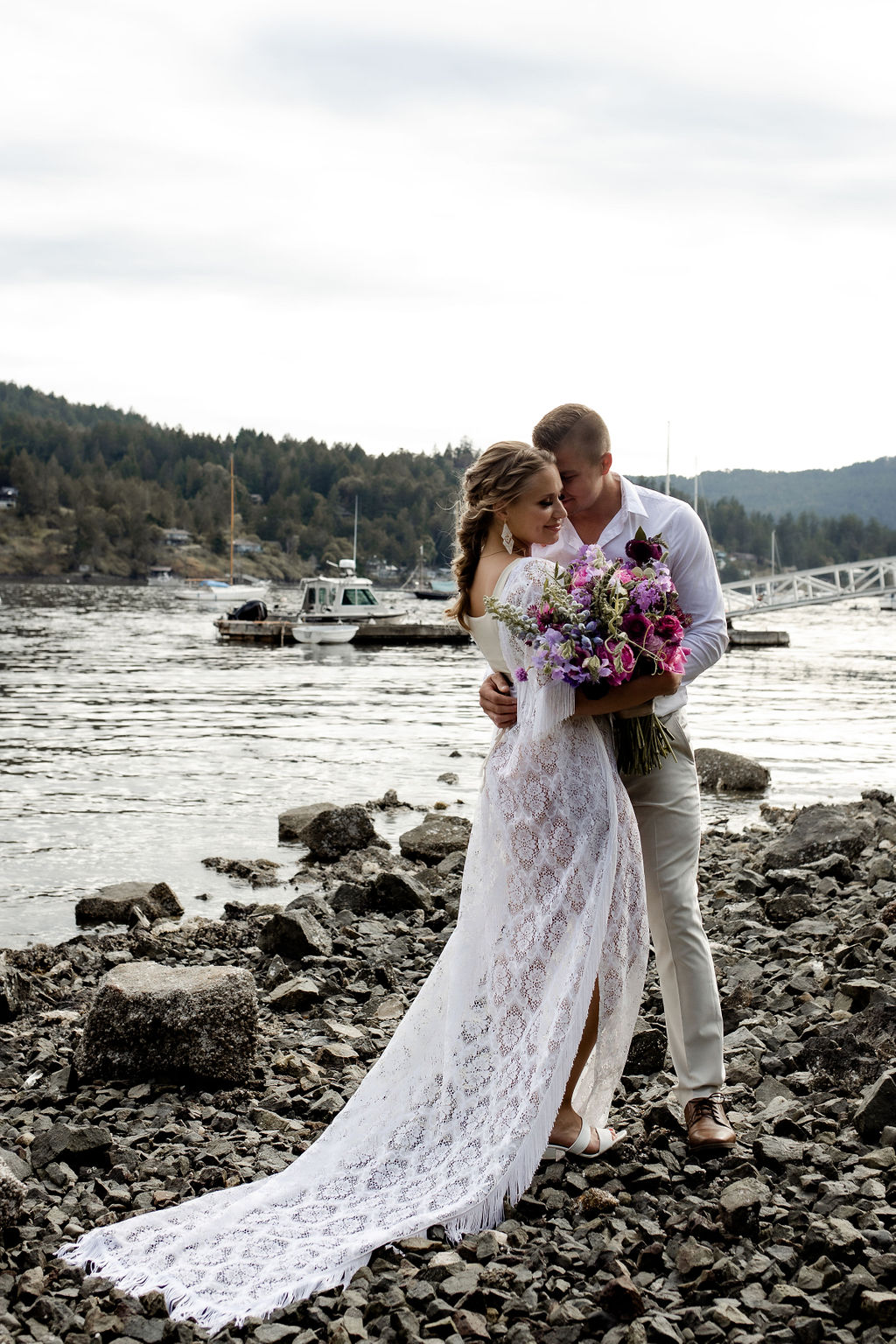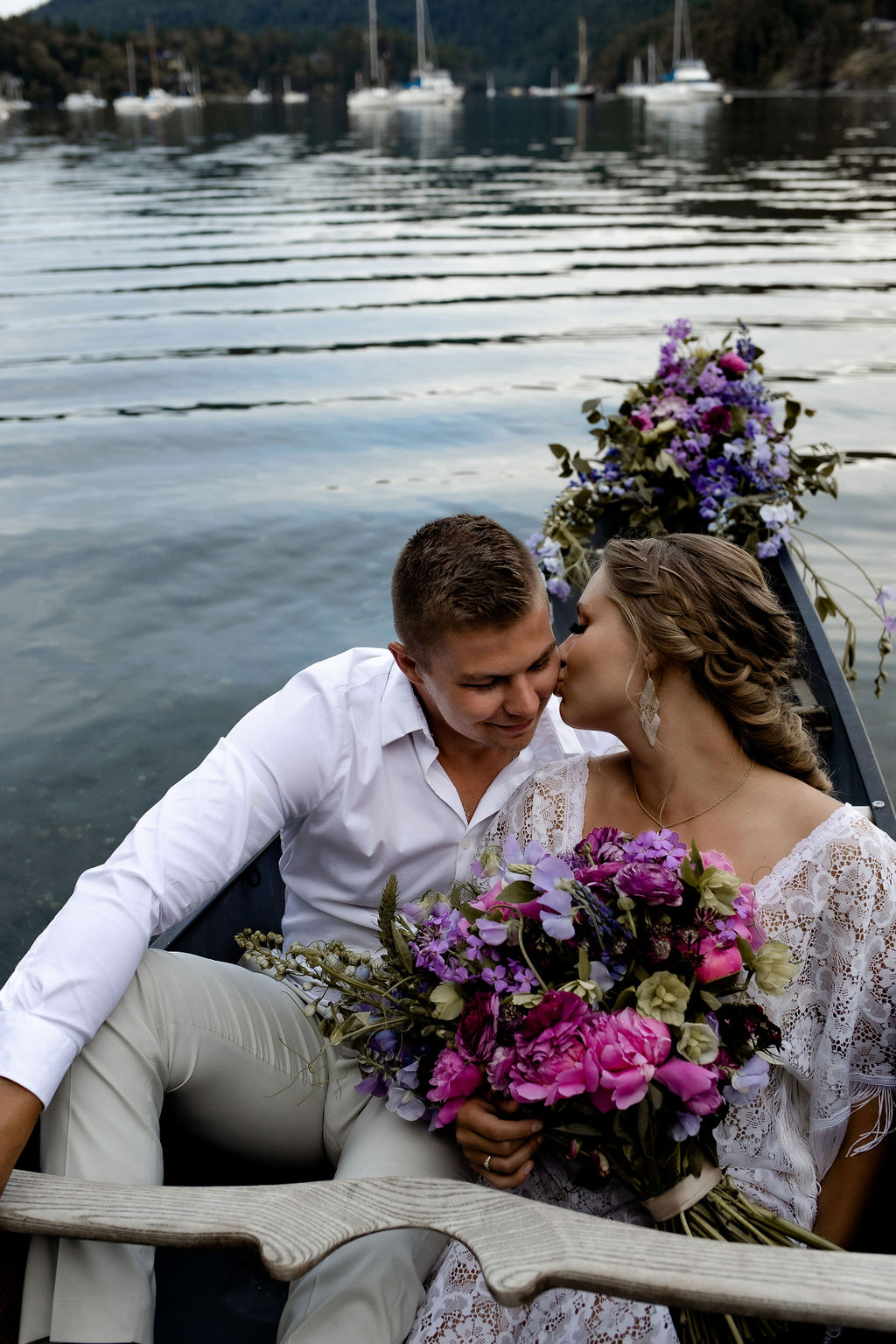 Bride with wedding day braid in her hair sits in canoe with flowersAdventure Elopement Groom in a canoe on Vancouver IslandAdventure Elopement Couple pose in front of the ocean on Vancouver IslandGroom lifts his bride out of a canoeGroom dips his bride in front of a red canoe Groom kisses brides hand while sitting in a canoe on Vancouver IslandNewlyweds paddle canoe filled with purple and pink flowers on Vancouver IslandAdventure Elopement couple snuggle in the bottom of a canoe with flowers above themCanoe for Two wedding kissesWedding bouquet of pink and purple flowersFlowers on the front of a canoe by Little Bee Blooms Vancouver IslandBride balances along pier as groom holds her hand by Amanda Reed PhotosNewlyweds hold hands and walk along the stone beach on Vancouver IslandBride holds pink and purple bouquet beside ocean edge by Little Bee Blooms Vancouver IslandNewlyweds kiss along the ocean edge on Vancouver IslandNewlyweds kiss with boat behind them on Vancouver Island