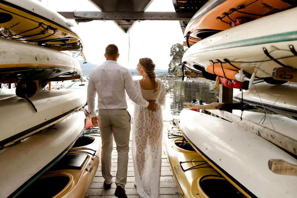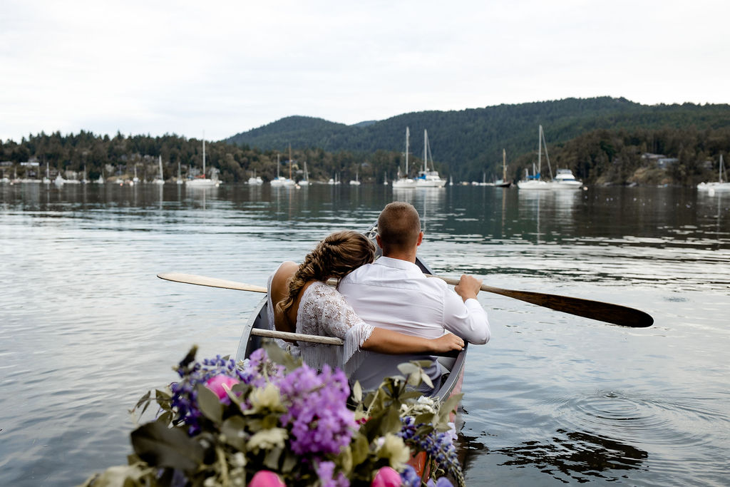 Adventure Elopement + Canoe Romance…so you would like to have an adventure elopement in true west coast style, but you are not up to hiking to the top of a cliff? No worries! You can have that west coast adventure vibe, and all that nature has to offer by eloping in a canoe. Or, after your ceremony, peacefully paddle off with your photographer for those quiet moments together—a truly romantic way to spend some time together on your wedding day.