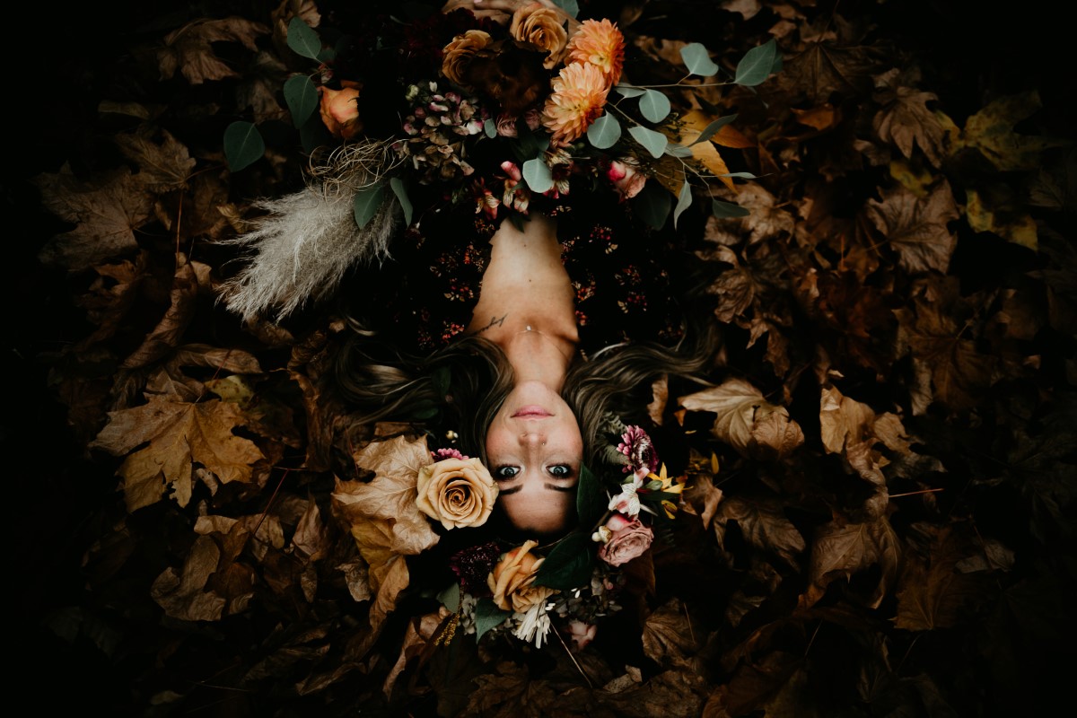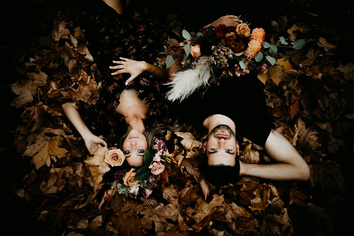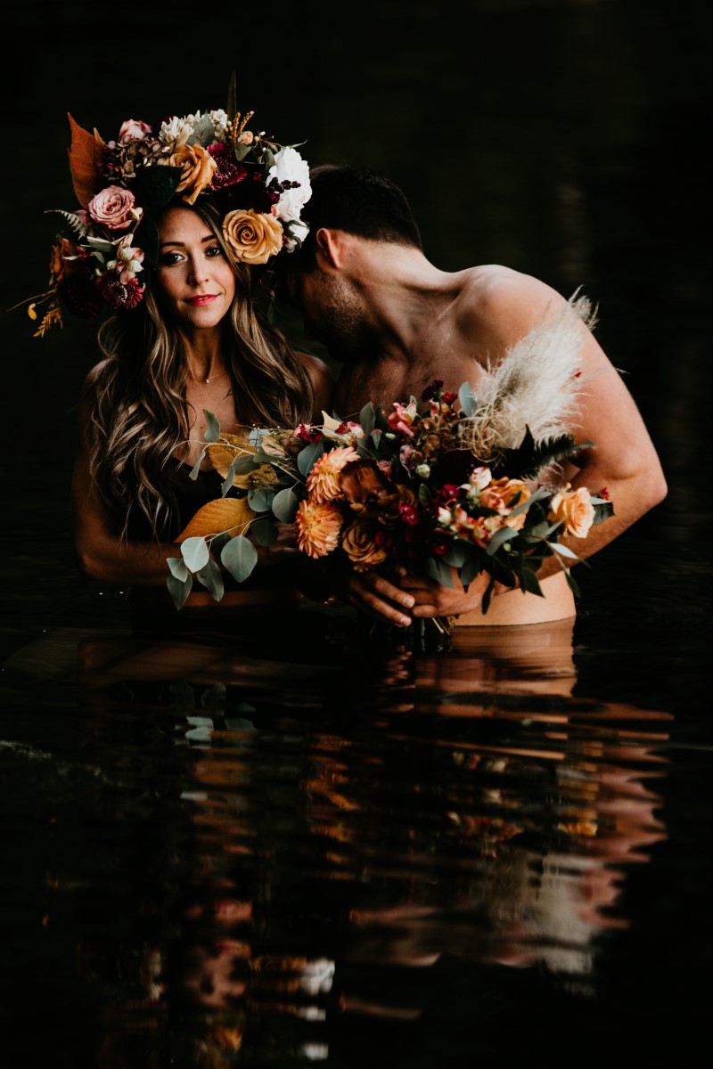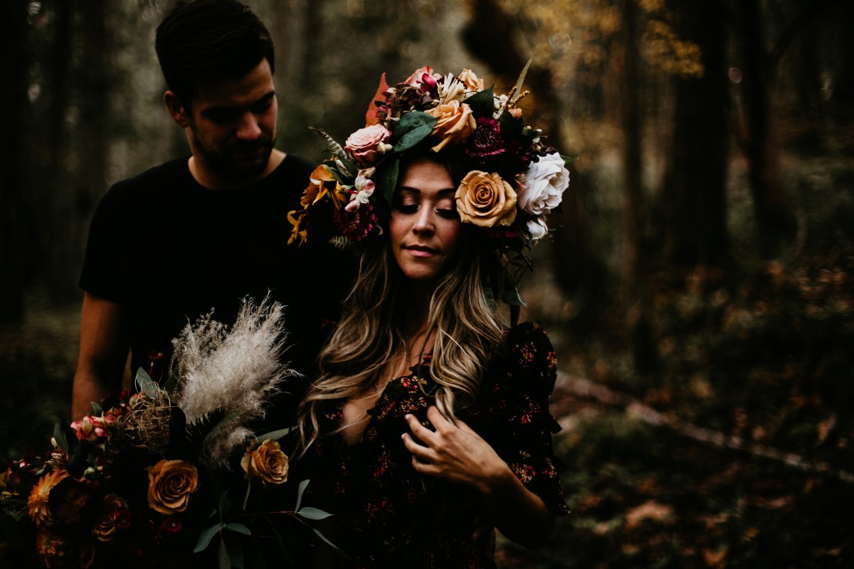 This couple modeled for an over the top romance shoot deep in the forest. Fall colours are all around as they lie in beds of leaves. The floral design features deep peach, cream and pink roses, eucalyptus, golden leaves, dalhias, anemone and cream feathers. The black lace dress adds to the rich bohemian feel of the entire natural landscape.
