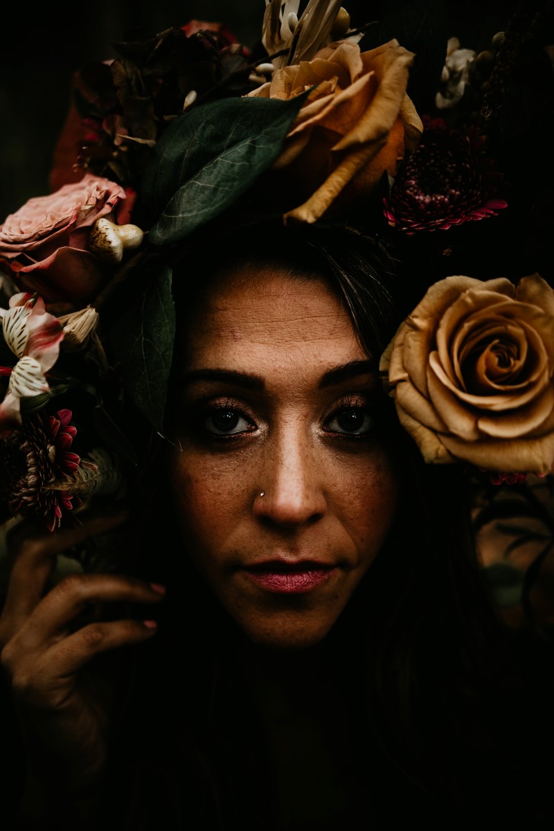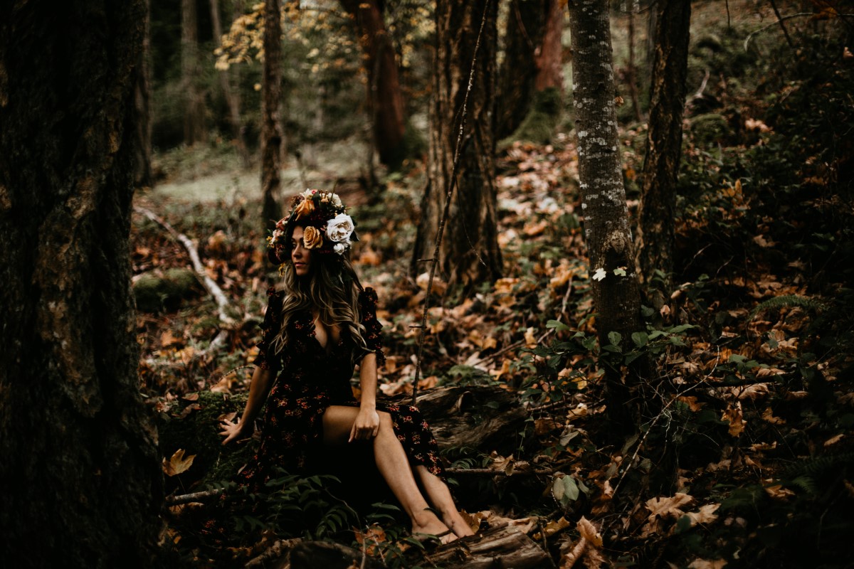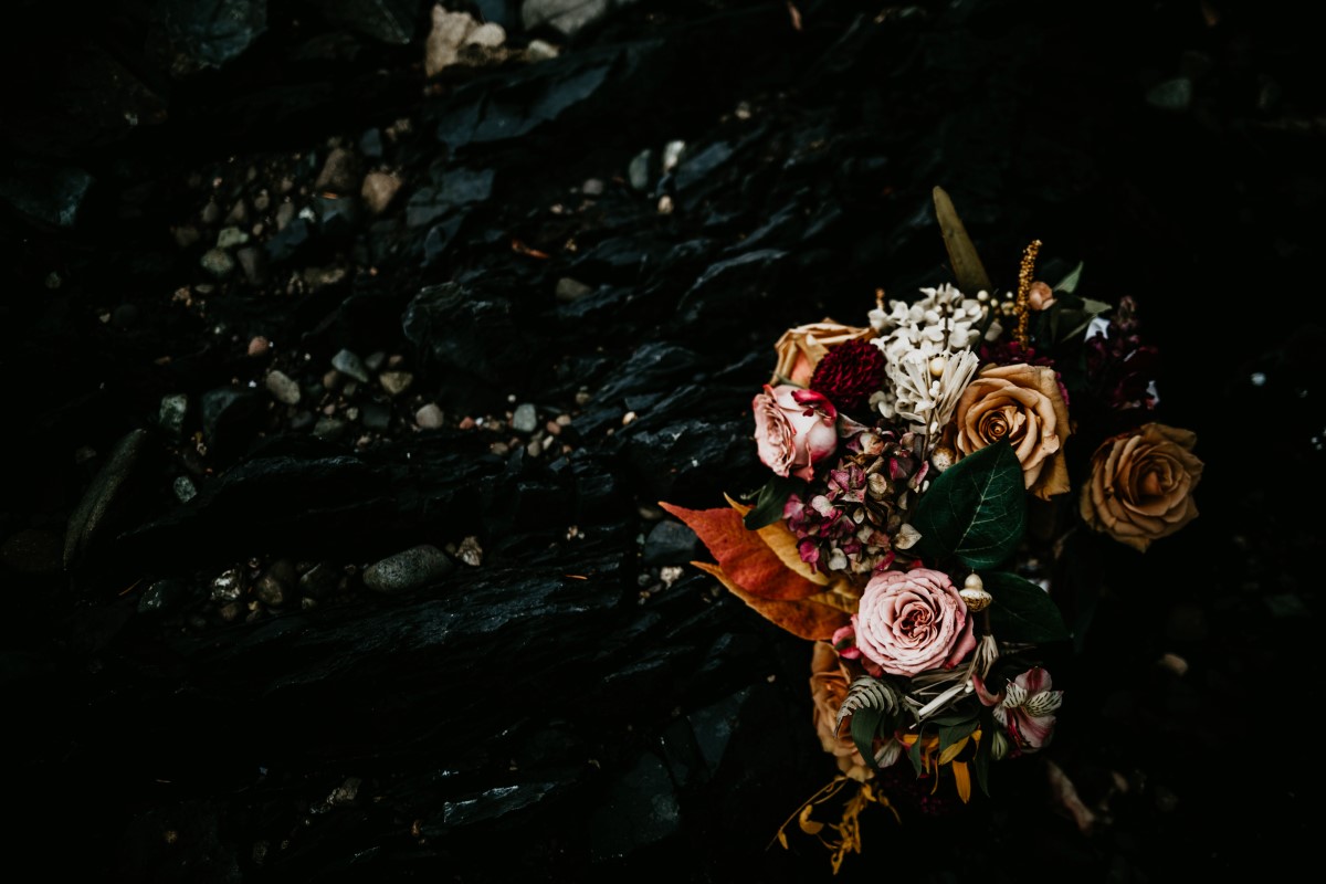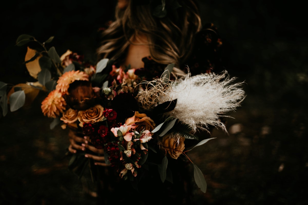 This couple modeled for an over the top romance shoot deep in the forest. Fall colours are all around as they lie in beds of leaves. The floral design features deep peach, cream and pink roses, eucalyptus, golden leaves, dalhias, anemone and cream feathers. The black lace dress adds to the rich bohemian feel of the entire natural landscape.