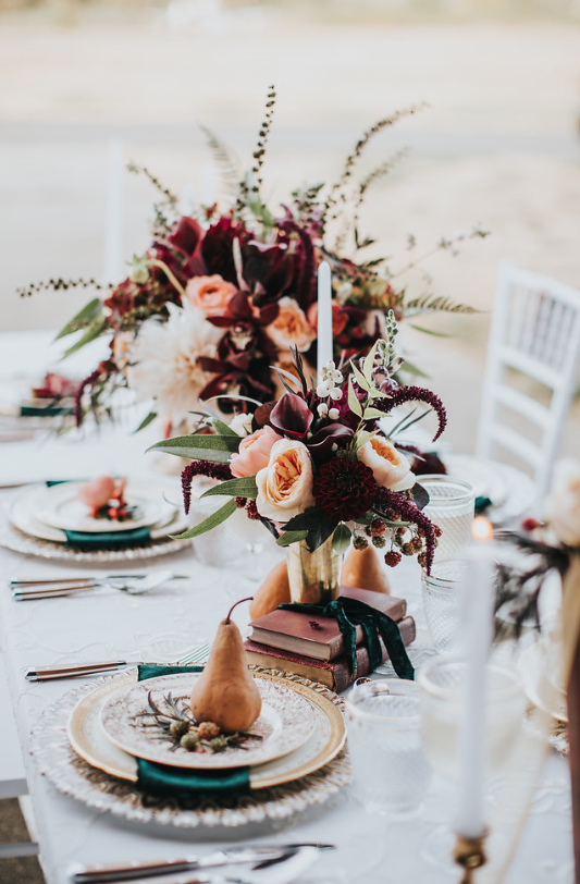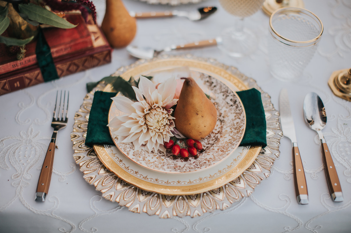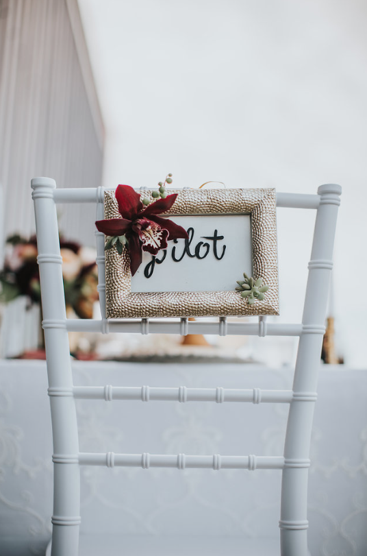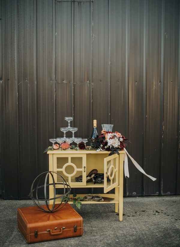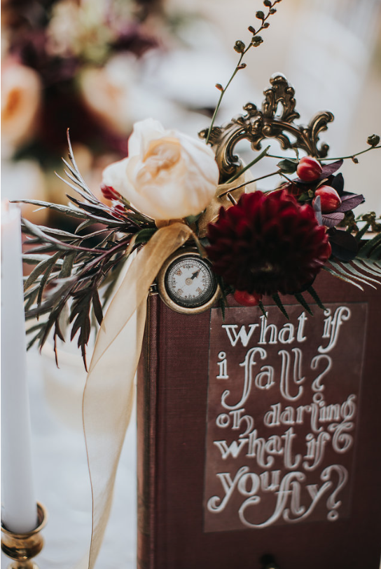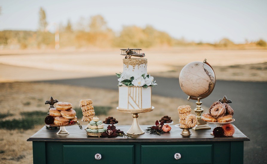 We love all the AMAZING DETAILS – vintage jewelry, the lace overlay on the table, the plated pears and the doughnuts! Always the doughnuts! The small ‘pilot’ signs on the backs of the beautiful chairs are a lovely shout out to the theme.