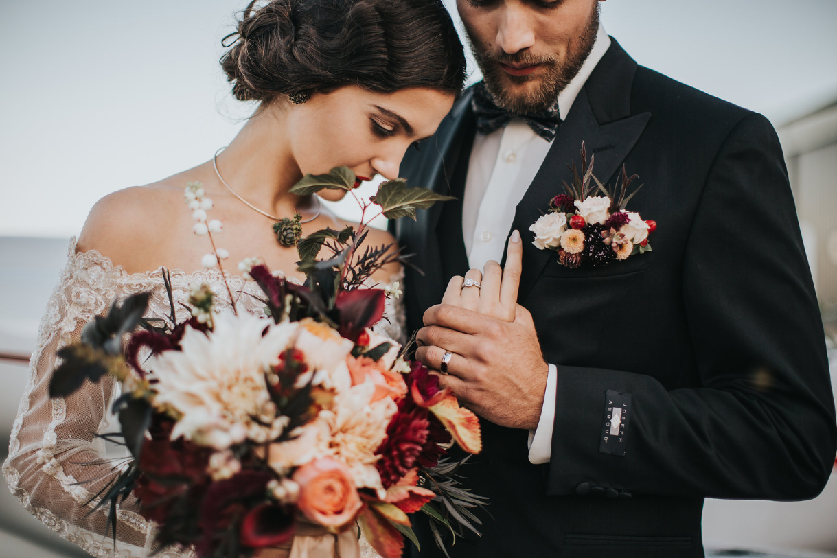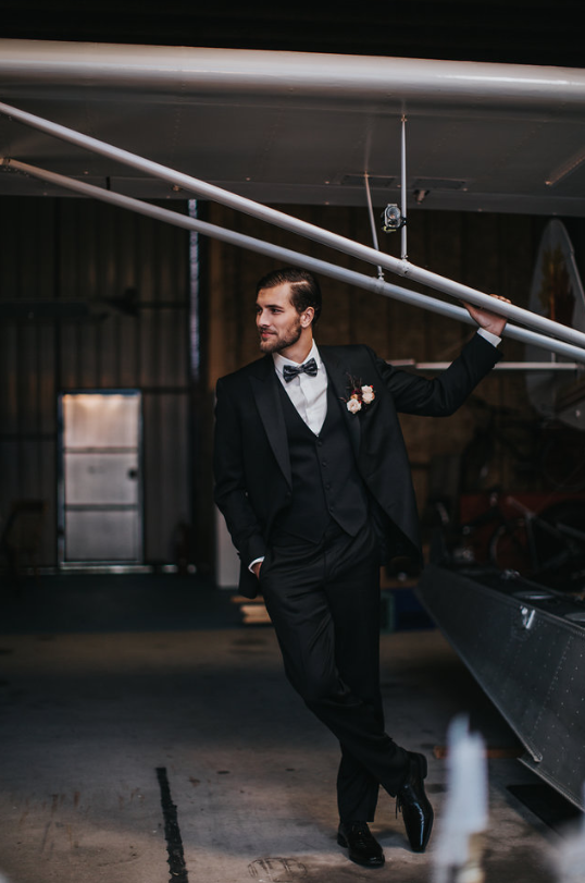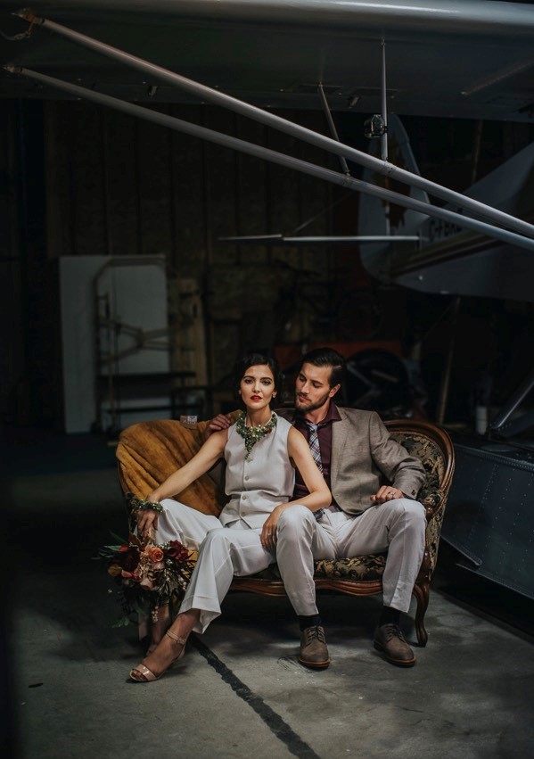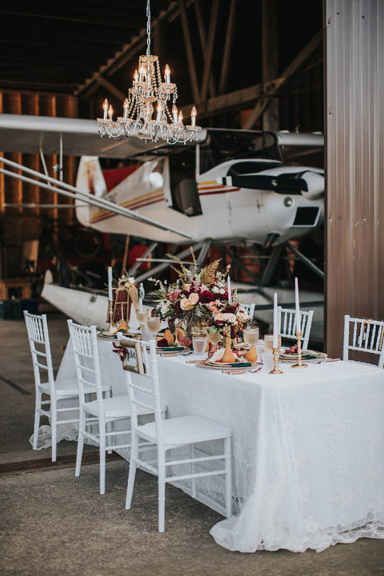 PHOTOGRAPHY • Rivkah Photography, CONCEPT CREATOR, PLANNER, STYLIST, AND DECOR DESIGN • Chanel, Rebekah + Katie of Sublime Celebrations, and Karen of Bezaire Event Design. FLORAL DESIGN, NECKLACE, AND EARRINGS • Foxgloves Flowers, STATIONERY DESIGN • Studio 745, VENUE AND AIRPLANE • Courtenay Airpark, GOWN • Ladybelle Bridal, BRIDE’S PANTS • Reitmans, GROOM’S FORMALWEAR AND BRIDE’S VEST • Moores Clothing for Men, SHOES • Shoebiz, HAIR • Emma – Scorpio’s Salon, MAKEUP • Shelby Lynn Makeup Artistry, RINGS • Graham’s Jewellers Ltd., RED CARPET, TABLE, CHAIRS, CHANDELIER, AND WHITE LINENS • All In One Party Shop, PLATES, CANDLESTICKS, AND LANTERNS • Party Mood, NAPKINS AND CANDLES • Bezaire Event Design, FLATWARE AND GLASSWARE • HomeSense, LUGGAGE • Winners, VINTAGE TABLECLOTH OVERLAY • Hollyhock Originals, BOOKS, CHAIR SIGN FRAMES, AND CHAIR SIGN CALLIGRAPHY • Sublime Celebrations, CAKE TOPPER • Winners TRUFFLES • Ivan’s Truffles, CAKE DESIGN • Bigfoot Donuts