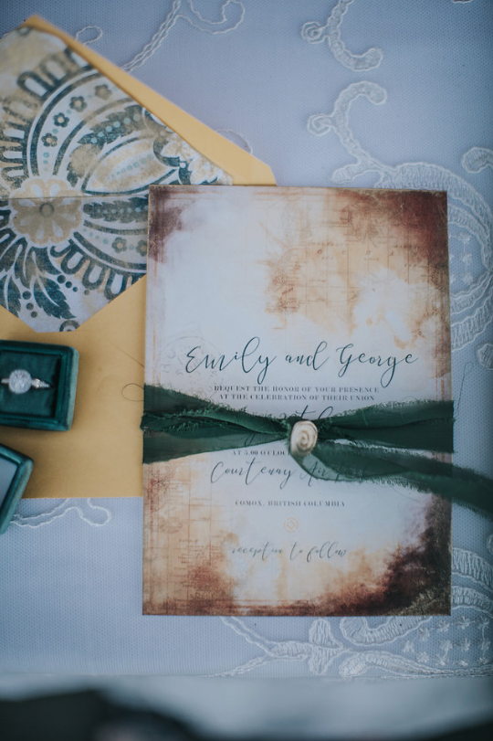 The PAPER SUITE pulls together all the design elements with moody blue and yellow vintage design. Even the vintage antique designed ring is in a blue box!