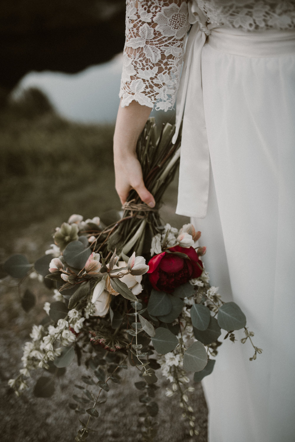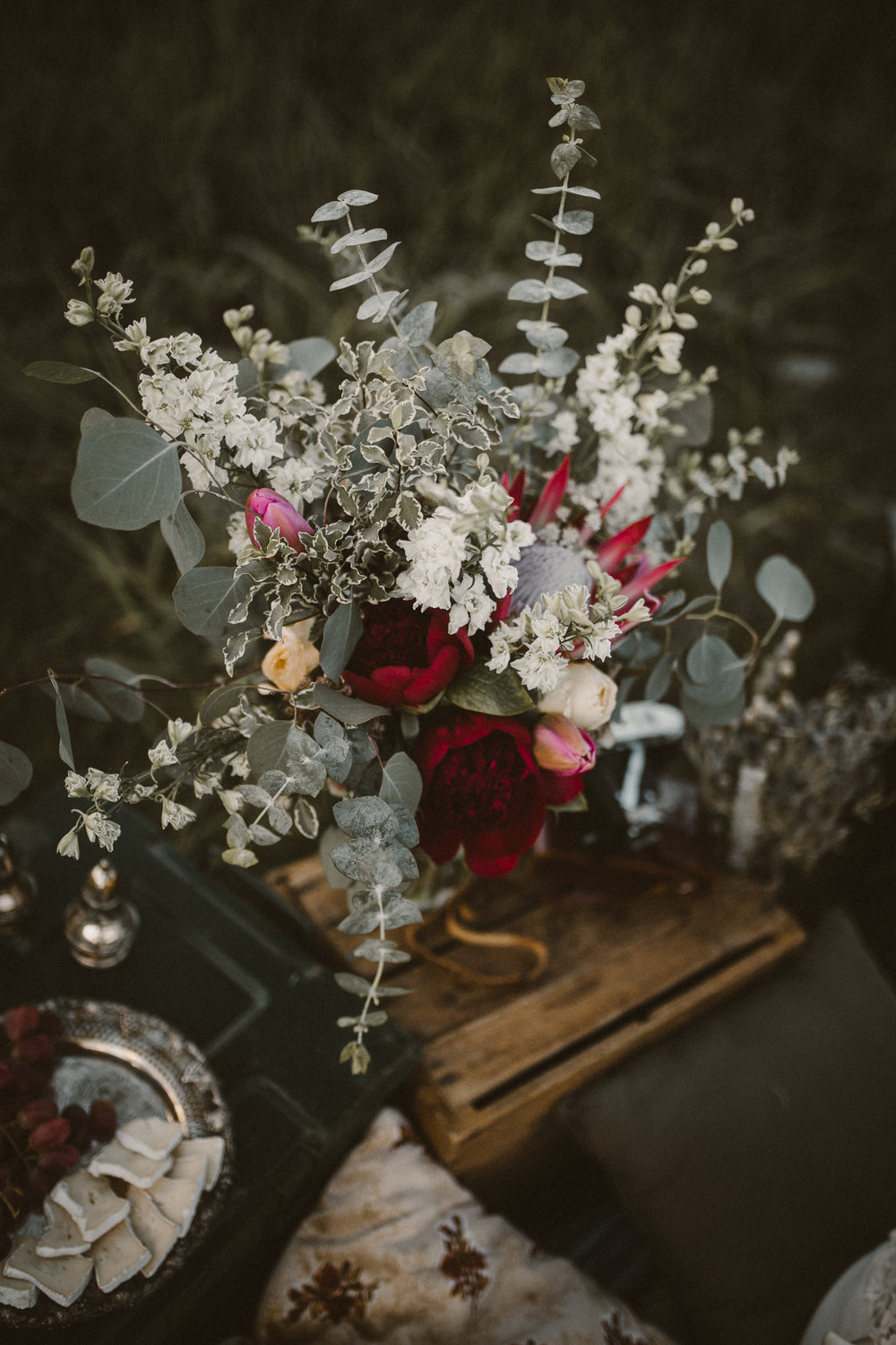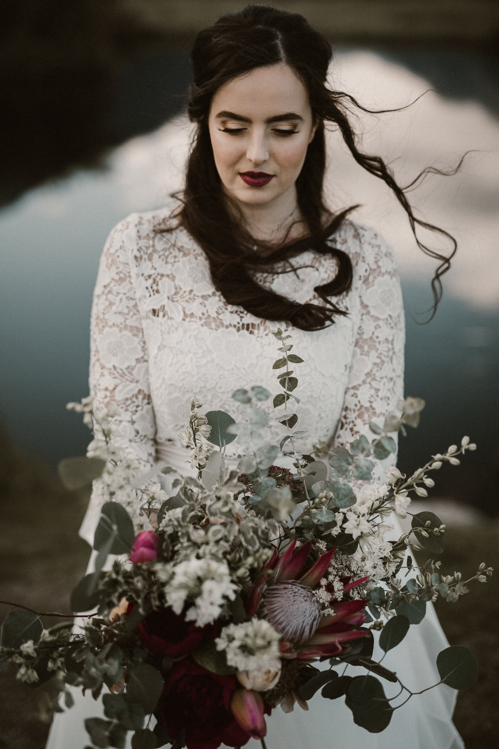 The bouquet of eucalyptus, burgundy peonies, Proteus and white larkspur is perfect against the color around the natural bride. The beauty of her intense lip and eye makeup paired with a relaxed ‘down’ hair style completes her boho look.