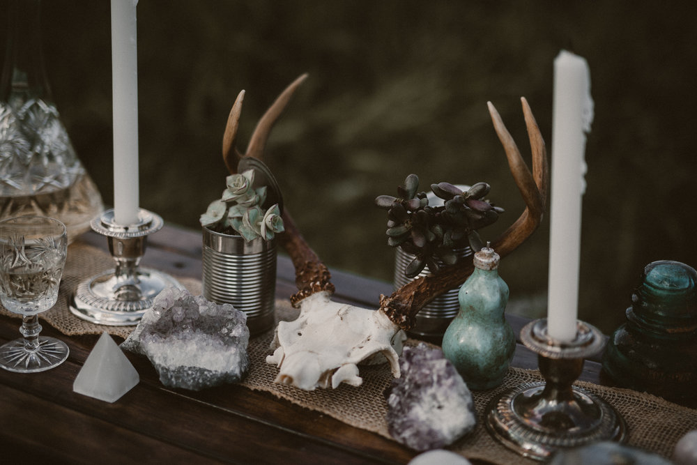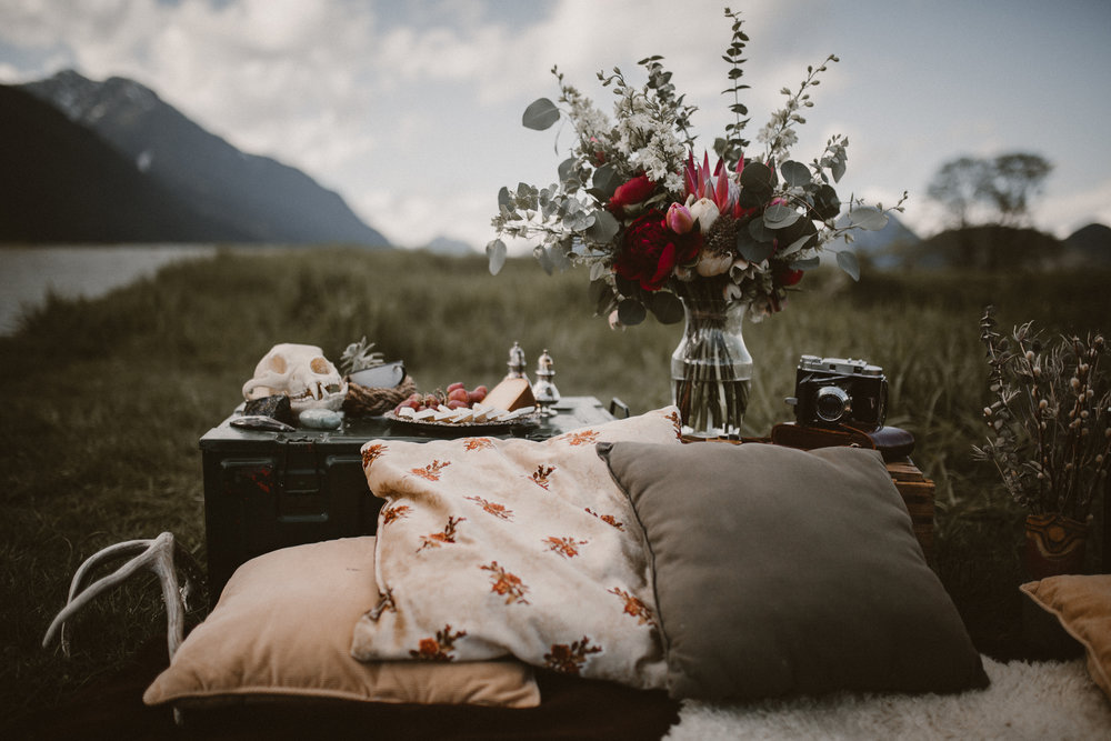 Glorious Mountain Sunset – Mountains set the perfect dramatic scene, don’t they? We fell in love with this shoot as soon as we saw the stunning mountain backdrop to this sunset picnic. While the naturally beautiful scenery is epic, we are also drooling over the lace sleeves and chiffon skirt on this lovely, locally designed wedding gown. And what’s not to love with the antlers, floral, candles and rocks which grace the table at this wonderful picnic?