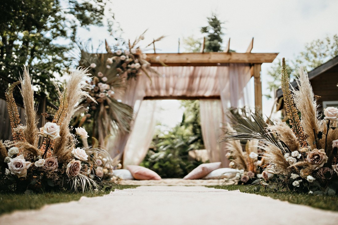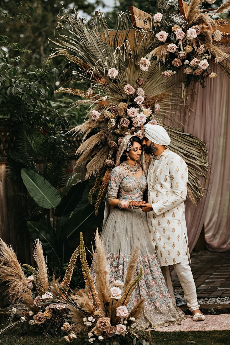 When we read the bride’s description of her wedding, we knew that these two were a special couple. Harneet wrote: “We knew we wanted to move forward with our lives in marriage, regardless of the challenges. However, it was important for us to plan a safe wedding and a great experience for us and our families. While everyone supported our wishes for a wedding this summer, it took some time to get people to feel comfortable breaking away from some traditions, such as large indoor weddings and a week of festivities. We ultimately planned the intimate, boho-garden wedding in my parents’ backyard that I’d always dreamed of! In the first week of June, we changed our wedding date to Saturday, July 4, 2020, and cut down our guest list from hundreds to 34. I only had a few weeks until our wedding, so my family and I came together very quickly to plan the decor, food, and other vendors. I had already booked Aquarius Art when I first began planning my wedding at the Gurudwara. Now that we were going to have a backyard wedding, I contacted the vendors of a boho photoshoot that my family and I were inspired by, and within about a week, I had booked them. It was reassuring to know that the wedding I had dreamt of could become a reality. I wore the bridal lehnga I had been eagerly waiting to wear from the Vivah Collection. Although we couldn’t have all of our family and friends attend the ceremony, we got to share the experience with them through a live stream. Hundreds of our family and friends tuned in and watched our ceremony via live stream, and we Facetimed some family throughout our wedding day.”