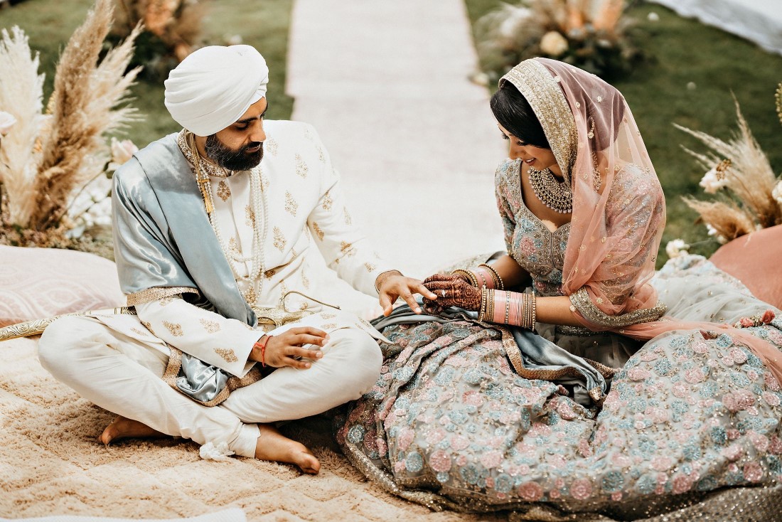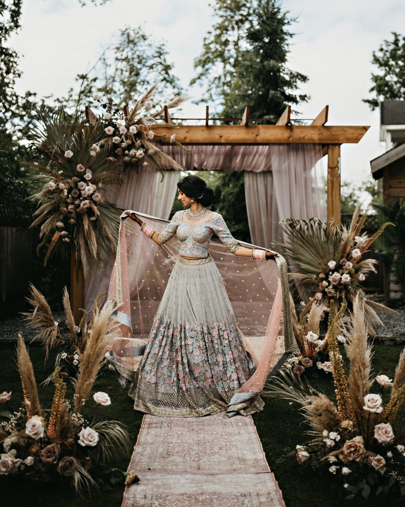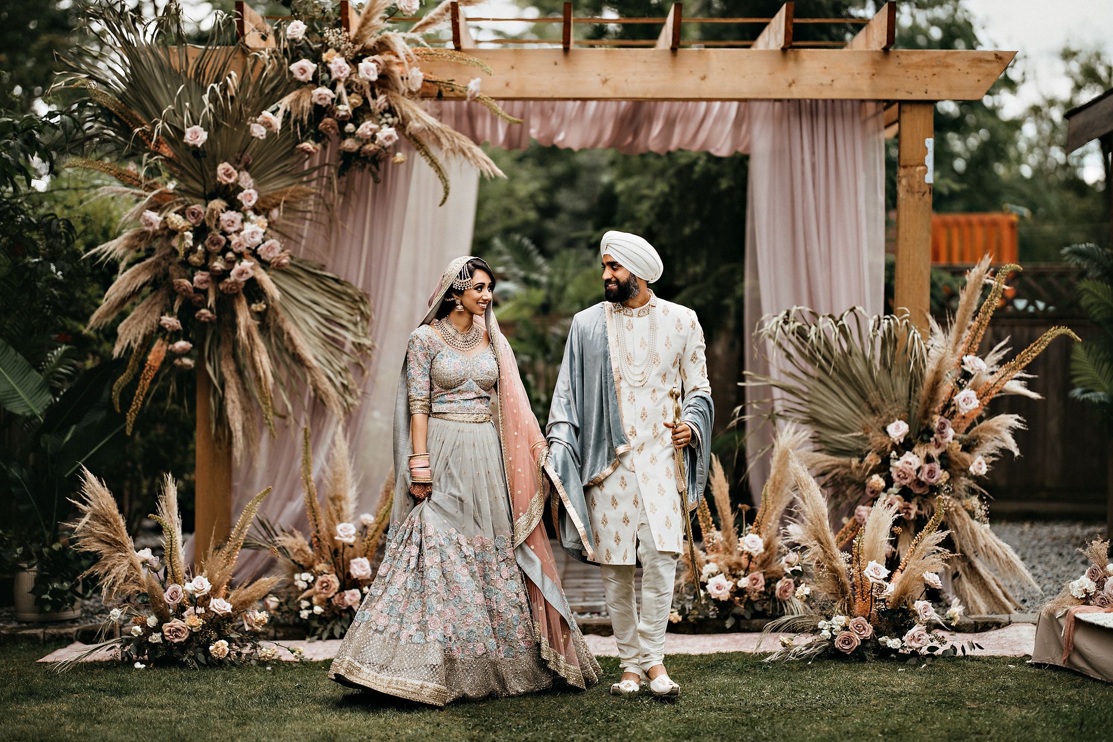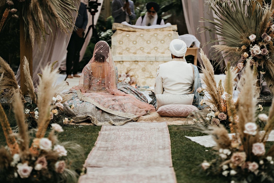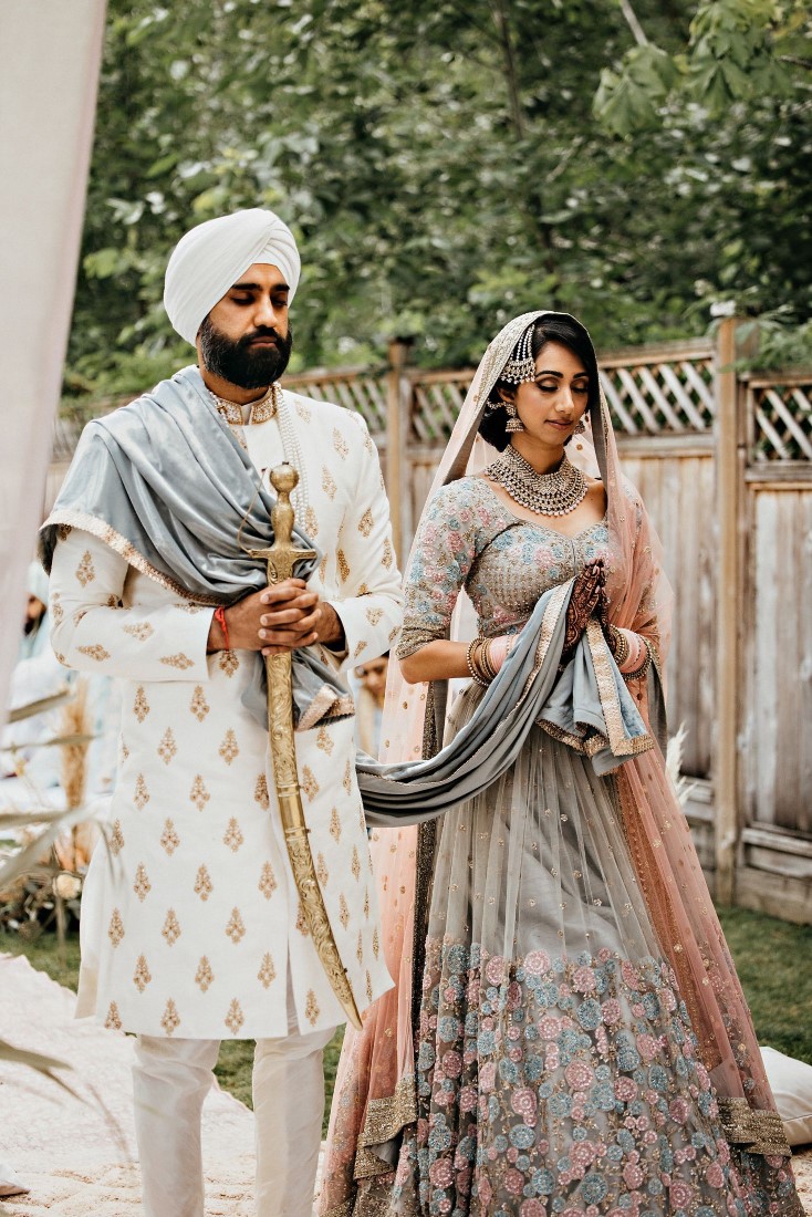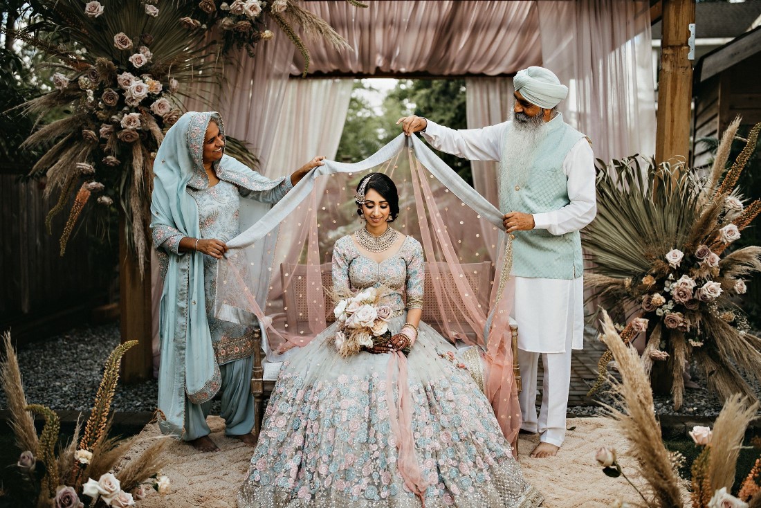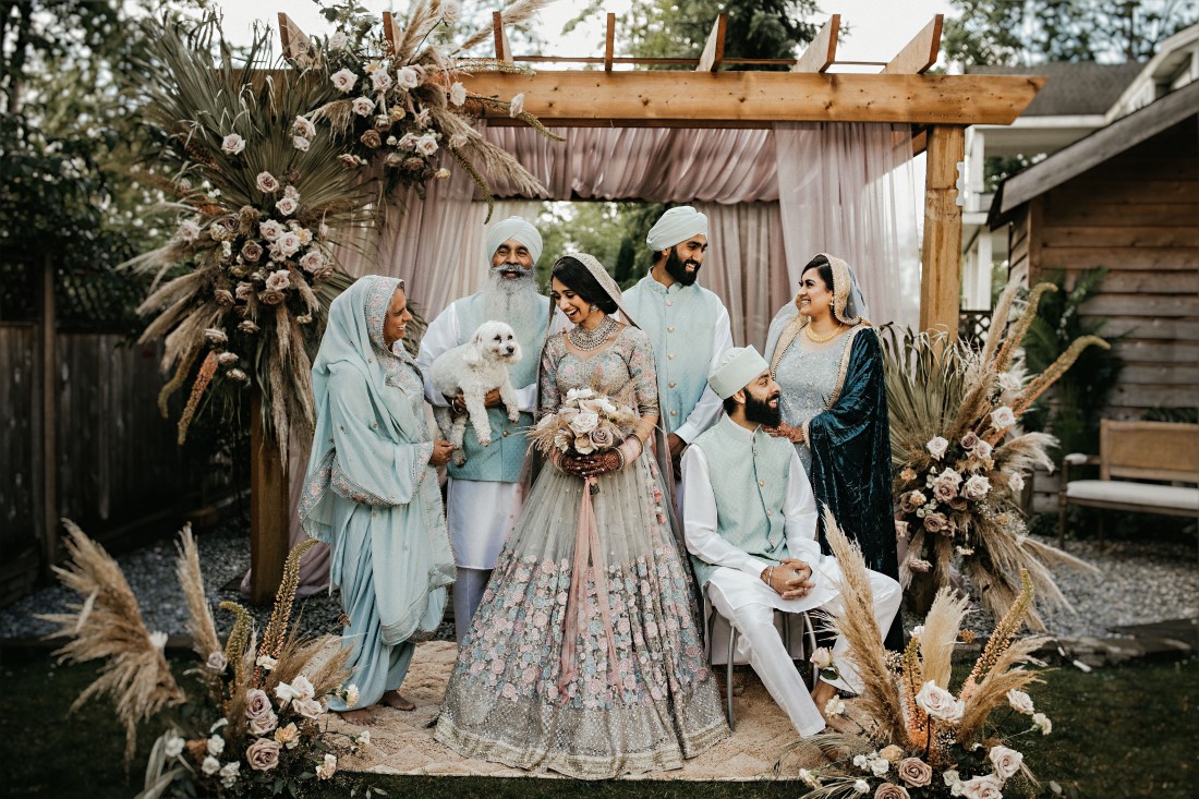 When we read the bride’s description of her wedding, we knew that these two were a special couple. Harneet wrote: “We knew we wanted to move forward with our lives in marriage, regardless of the challenges. However, it was important for us to plan a safe wedding and a great experience for us and our families. While everyone supported our wishes for a wedding this summer, it took some time to get people to feel comfortable breaking away from some traditions, such as large indoor weddings and a week of festivities. We ultimately planned the intimate, boho-garden wedding in my parents’ backyard that I’d always dreamed of! In the first week of June, we changed our wedding date to Saturday, July 4, 2020, and cut down our guest list from hundreds to 34. I only had a few weeks until our wedding, so my family and I came together very quickly to plan the decor, food, and other vendors. I had already booked Aquarius Art when I first began planning my wedding at the Gurudwara. Now that we were going to have a backyard wedding, I contacted the vendors of a boho photoshoot that my family and I were inspired by, and within about a week, I had booked them. It was reassuring to know that the wedding I had dreamt of could become a reality. I wore the bridal lehnga I had been eagerly waiting to wear from the Vivah Collection. Although we couldn’t have all of our family and friends attend the ceremony, we got to share the experience with them through a live stream. Hundreds of our family and friends tuned in and watched our ceremony via live stream, and we Facetimed some family throughout our wedding day.”