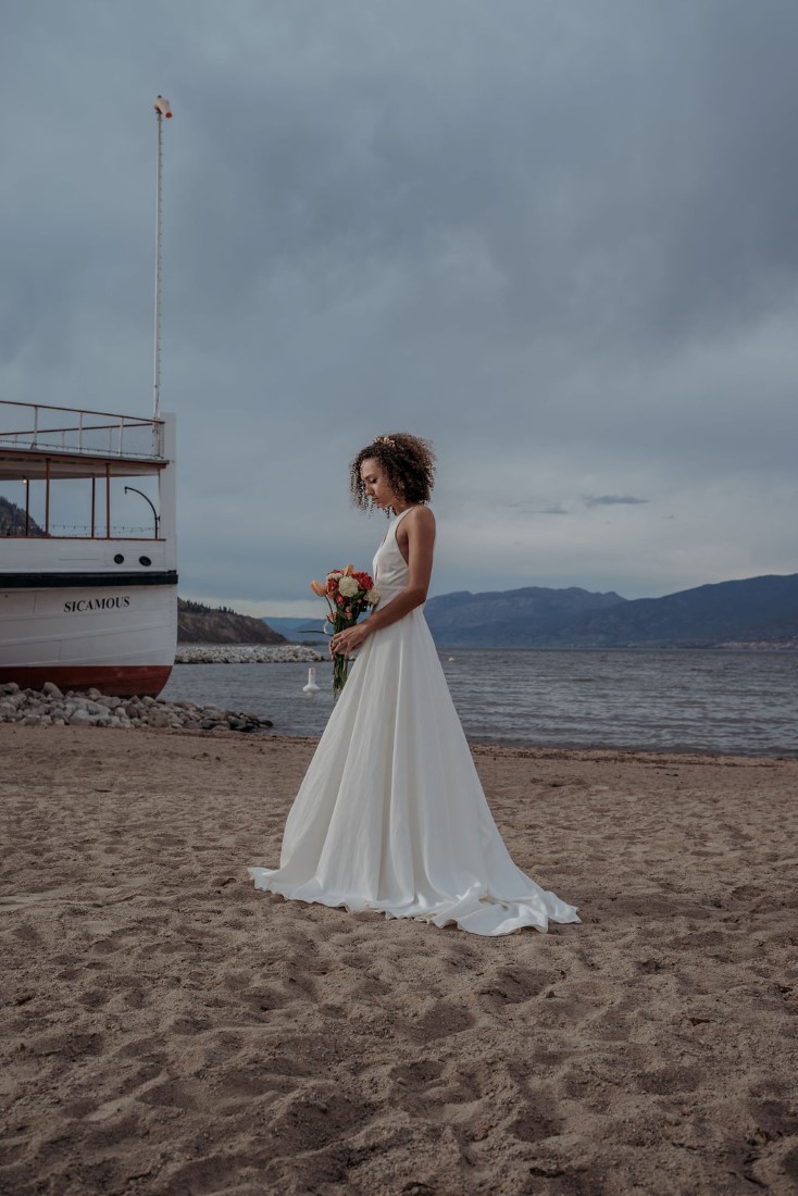 PHOTOGRAPHY – Vanessa Lee Imagery | DRESS SHOP- Whimsy and Wry | DRESS DESIGNER – Rebecca Schoneveld | RENTALS – The Blushing Pear | PAPER SUITE – Onyx Custom Stationery HAIR – House of Dennison | VENUE – Lakeshore Beach and the Sicamous (ship) in Penticton, BC | MODEL – Liza Klingers | BRIDAL TIARA – Davie & Chiyo | FLORALS – Safeway