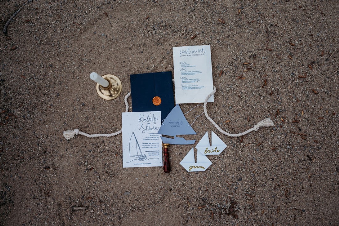 The paper suite especially creates a sailboat and sand feeling. The menu titled ‘First We Eat’ is perfect on the pedestal table that also has the sweetest sailboat place cards. Navy blue, light blue and white paper completes the water coloured palette.