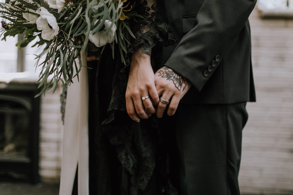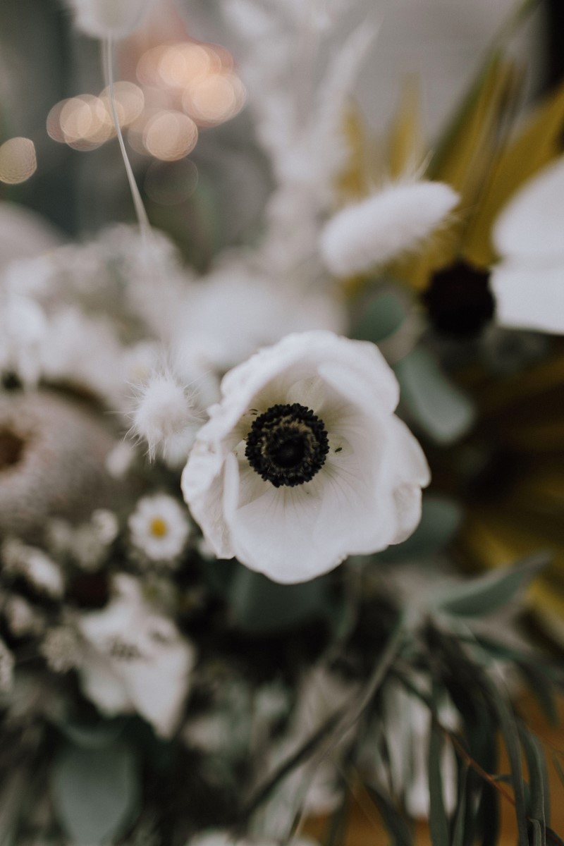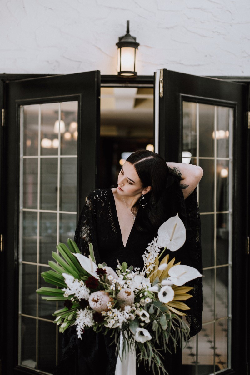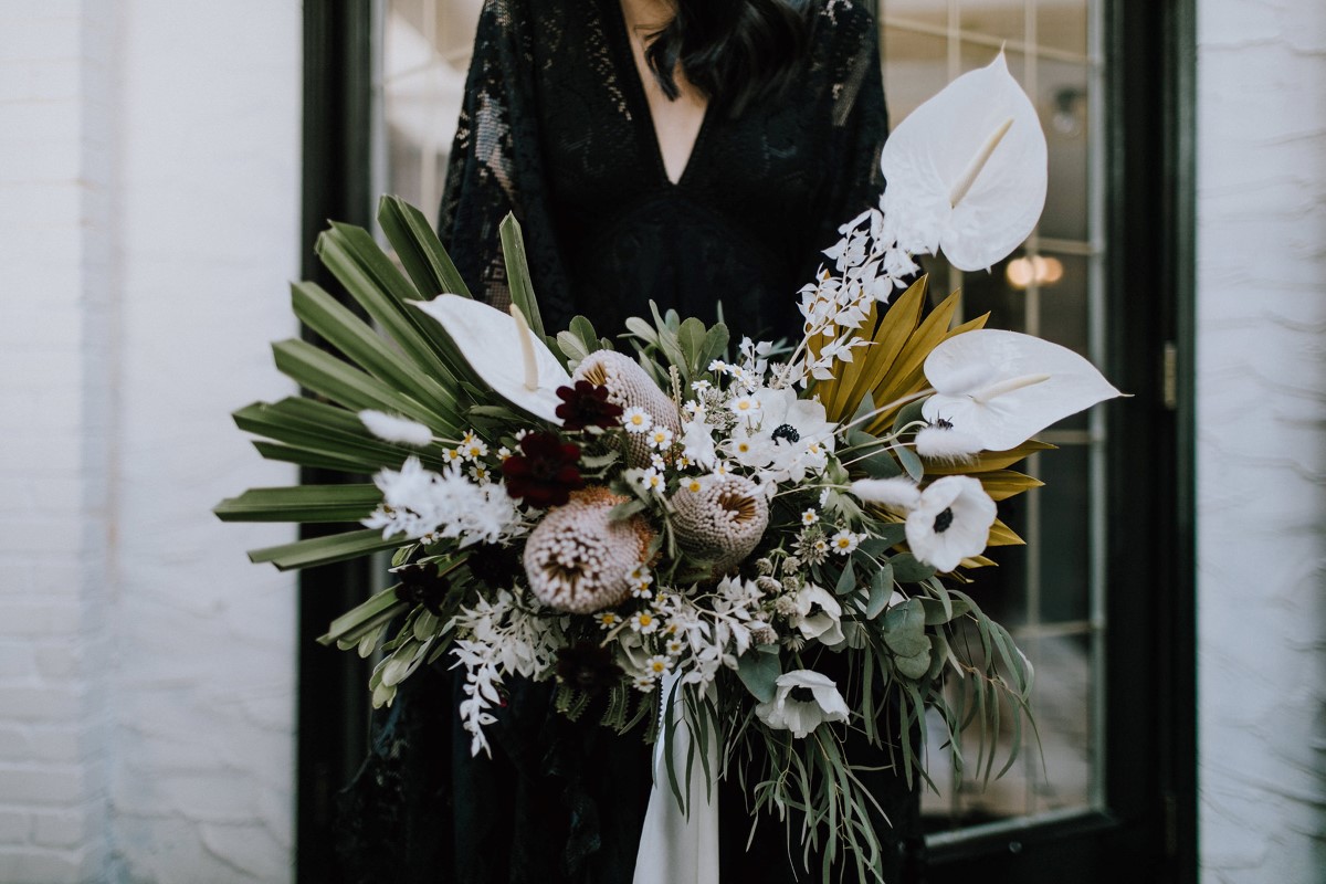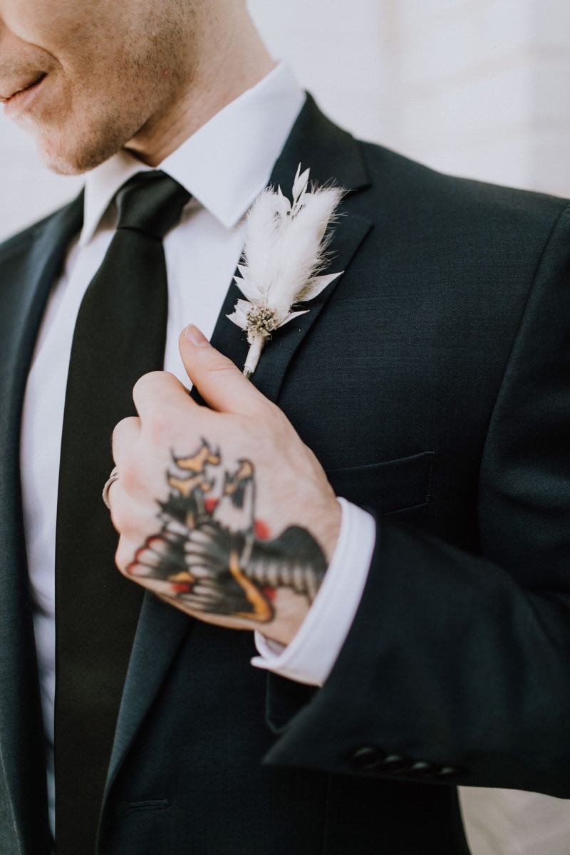Dramatic and stylish is the only way to describe the gorgeous bouquet showcasing palm leaves. The Penny Farthing Elopement palette features light grey, black and white along with floral greens. We love the especially original groom’s boutonniere featuring white feathers.