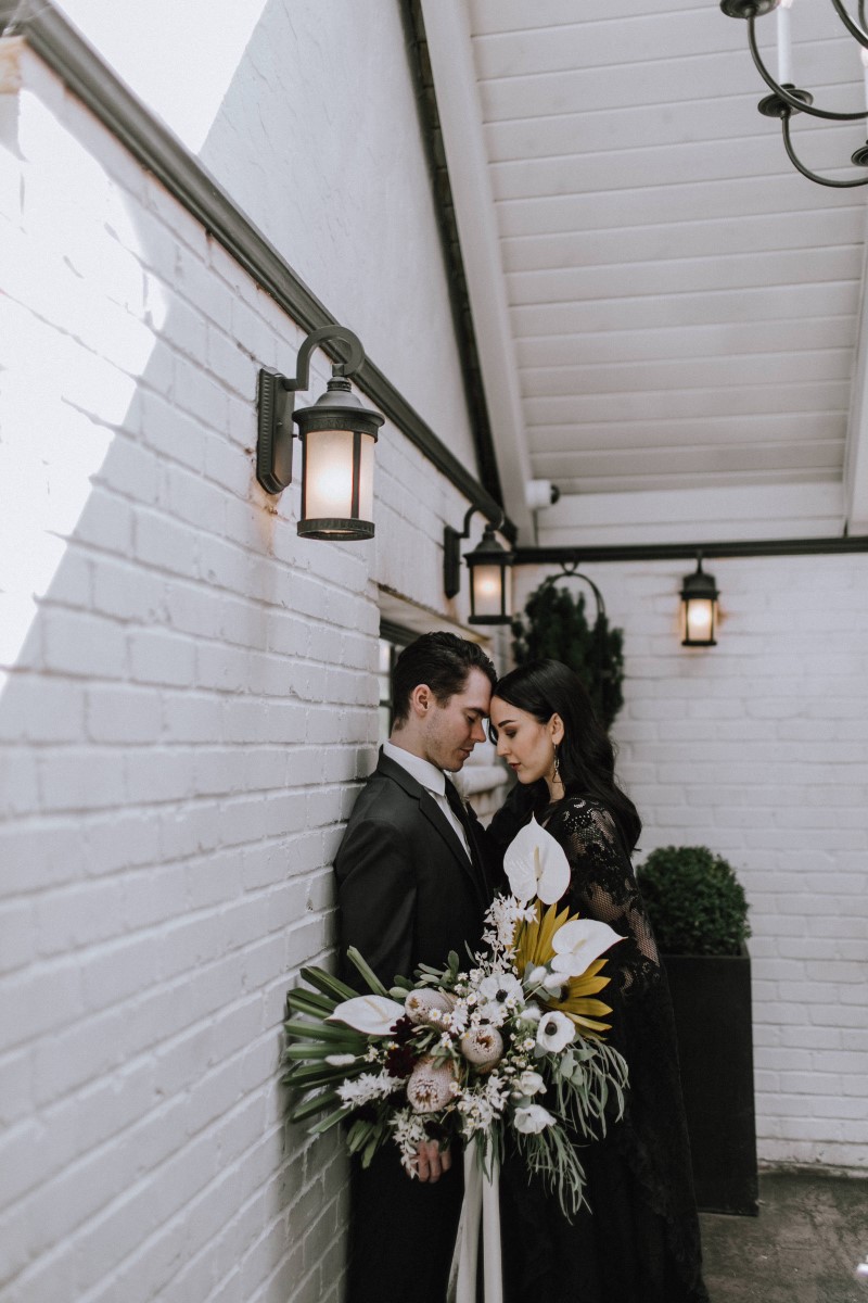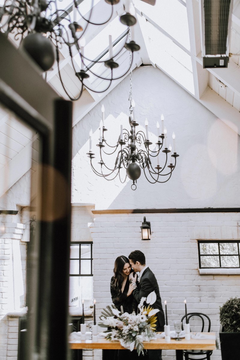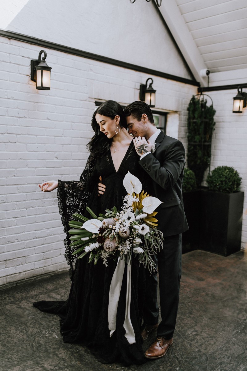 The bride wears a glamorous black lace gown that is swoon worthy. Delicate black lace compliments the decor palette and design features in the venue. The surrounding white walls draw the eye to the dark gown and groom’s deep gray suit. The intricate chandeliers are perfect relief to the starkness of the venue – a  perfect blank slate for decor.