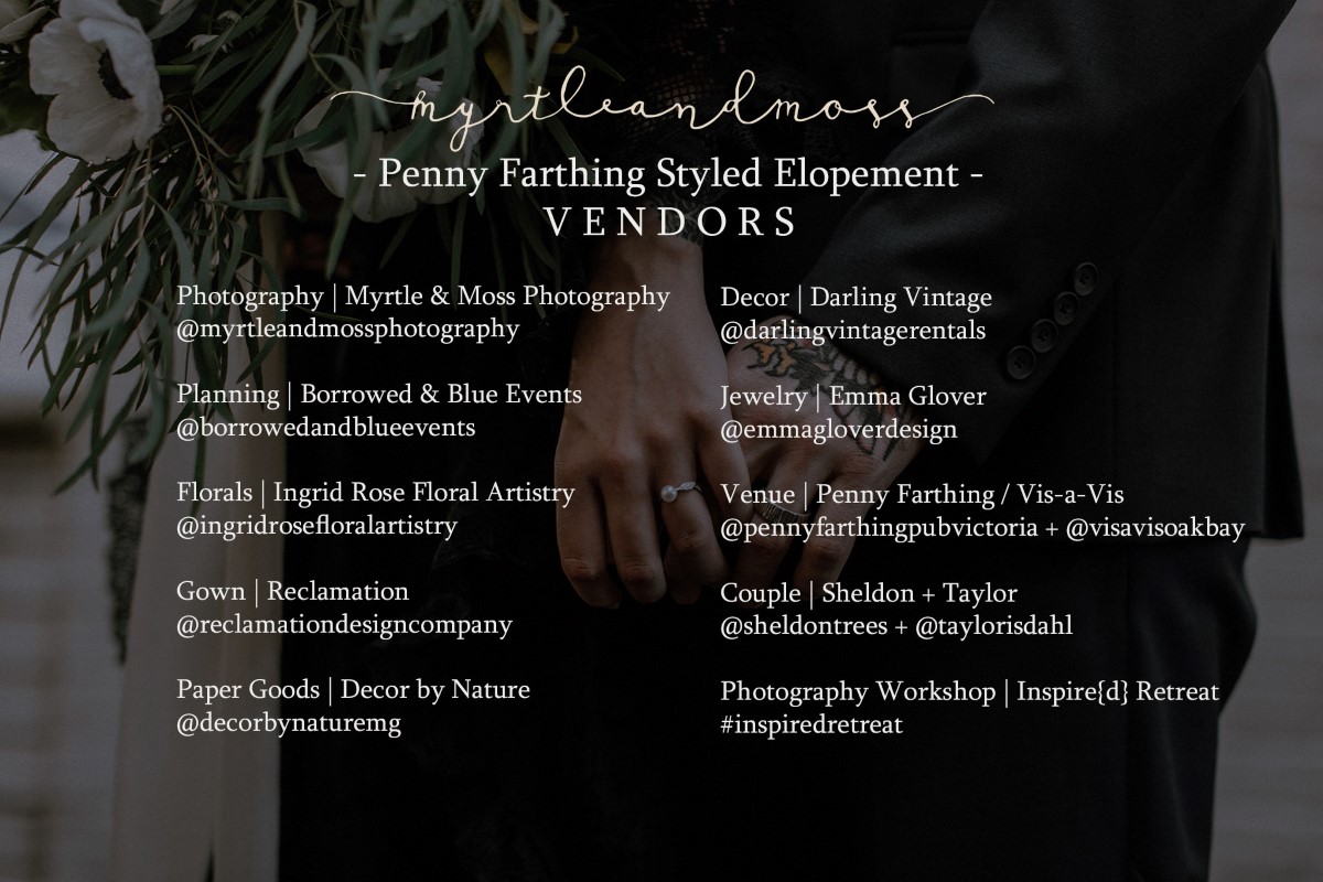 Myrtle and Moss PhotographyPHOTOGRAPHY: Myrtle and Moss Photography | PLANNING: Borrowed and Blue Events | DECOR: Darling Vintage Rentals | FLORAL: Ingrid Rose Floral Artistry | GOWN: Reclamation Design Company | VENUE: Penny Farthing Pub/ Vis-a-Vis | JEWELLERY: Emma Glover Design | PAPER GOODS: Decor by Nature | WORKSHOP: Inspire(d) Retreat | COUPLE: Sheldon + Taylor                                                                                                                                   Pennyfarthing Pub Wedding Editorial Vancouver Island