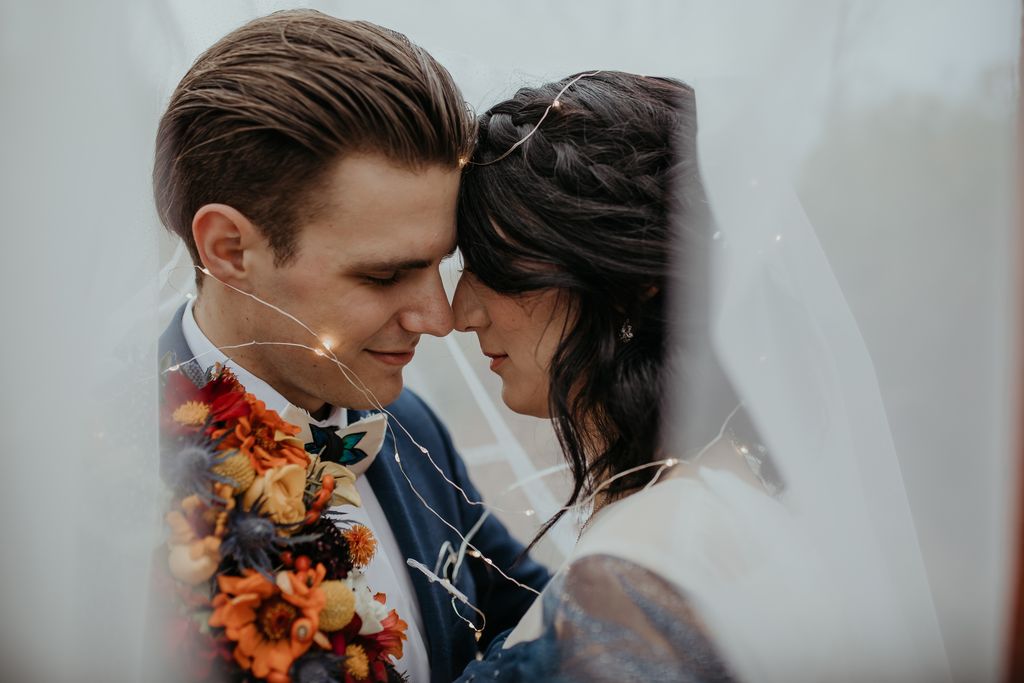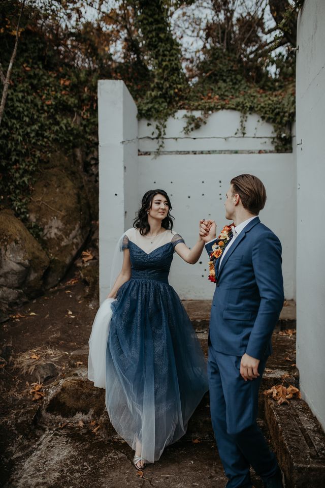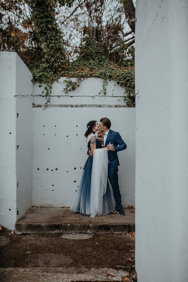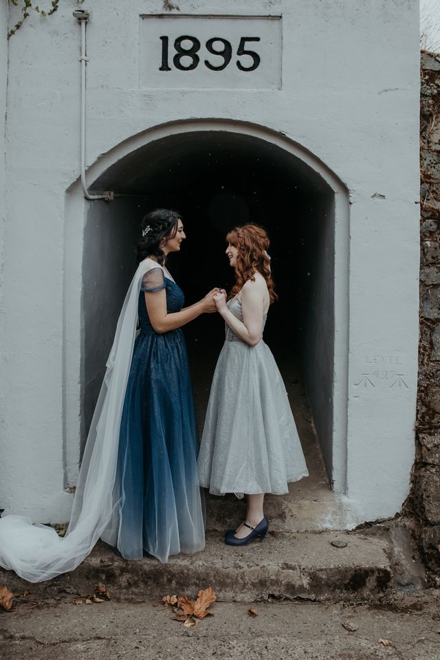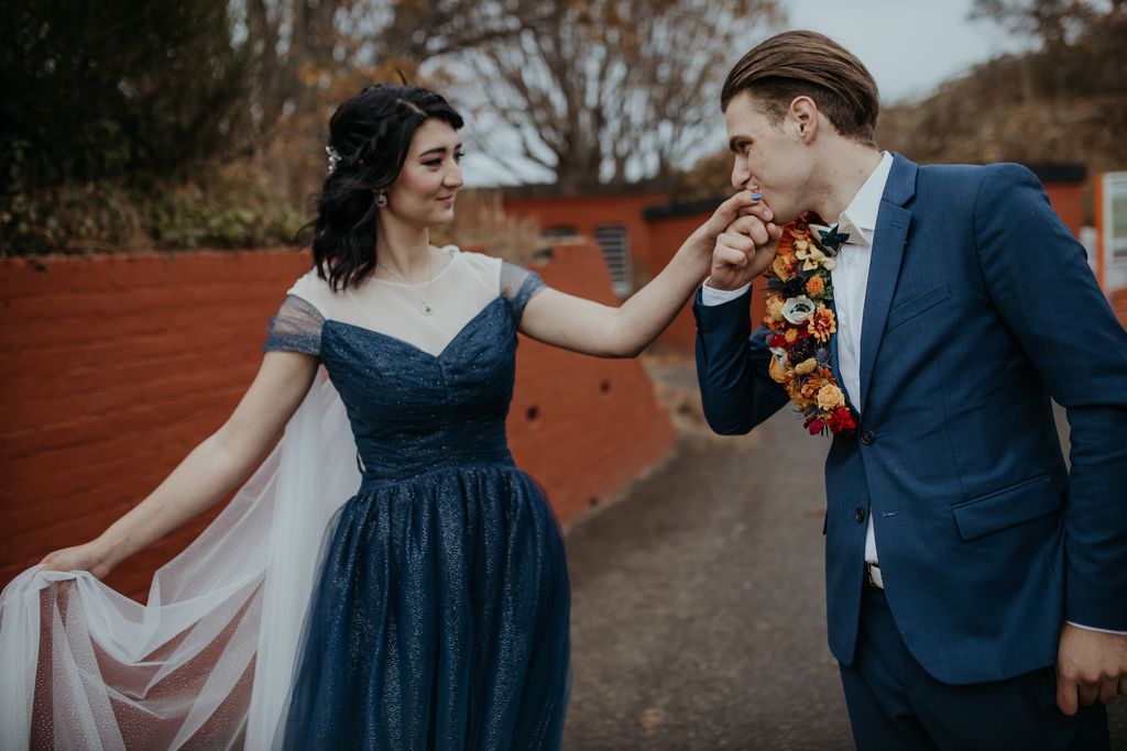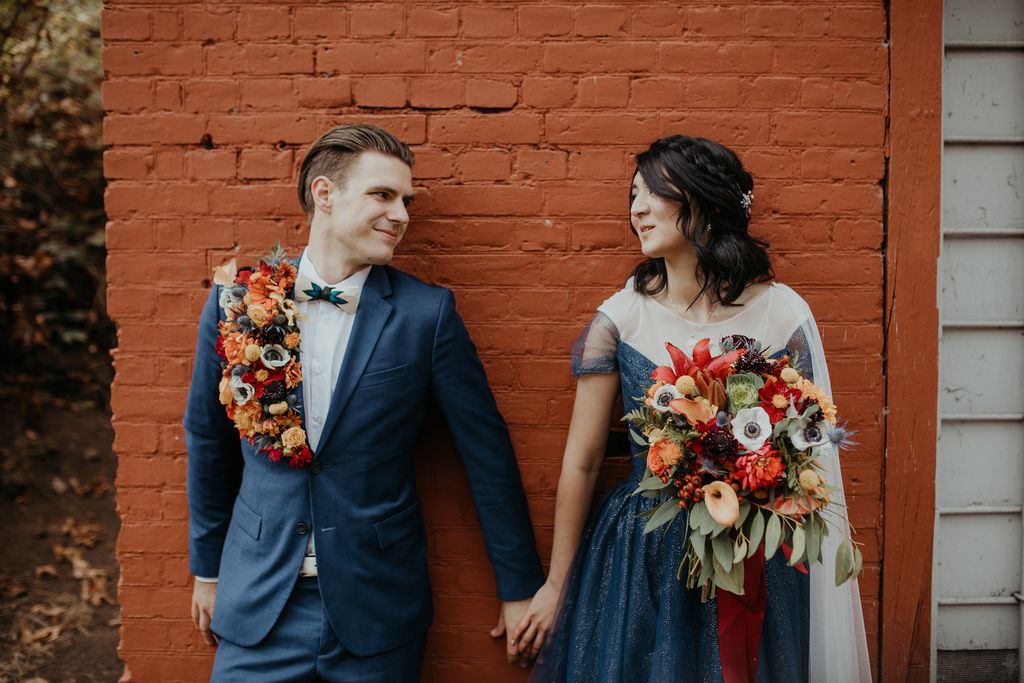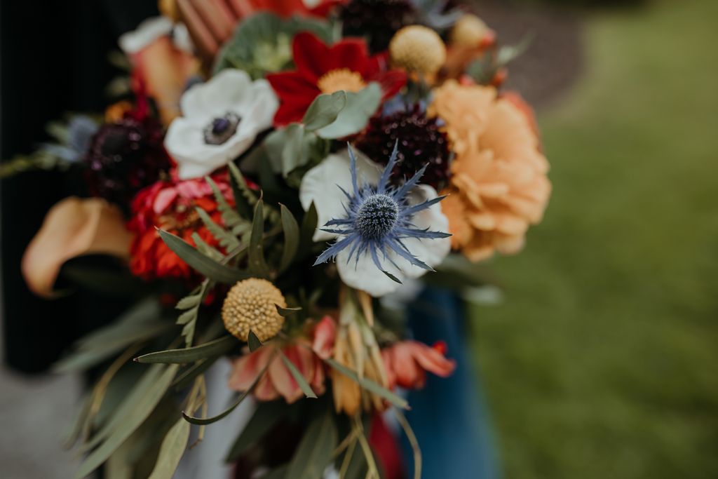 The bride and groom are both stylish characters, and we love the look. Emma rocked a sparkly midnight blue gown with a white caped veil attached and donned intricate hair jewelry. Shamus ensured he stole some of the limelight in a complementing blue suit and peacock bowtie. The bouquet brought it all together with jewel tones of every hue, and the eye-catching floral lapel (boutonniere) was the crowning touch. The wedding party wore light grey/blue vintage, which was the perfect foil to the color palette.