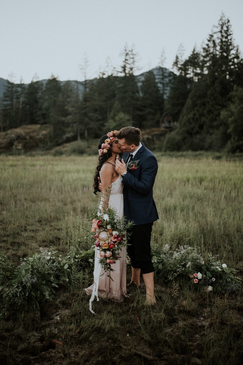 A boat filled with lush florals? A lakeside elopement? Yes, Please! This styled elopement was a collaboration between photographer Art + The Aerialist, Menze Visuals, and florist Kaye Fleur in Pitt Meadows, BC. The location, a remote sandbar on Pitt Lake, was only accessible by boat, which certainly added to the adventure!