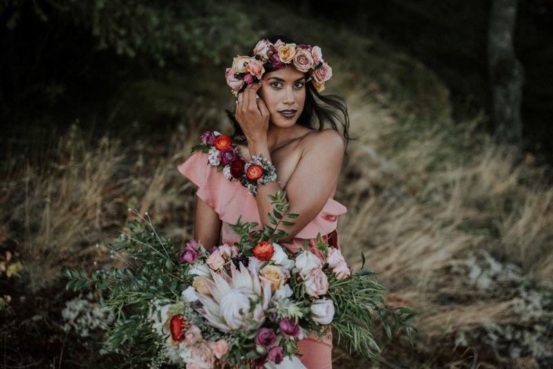 The fresh color pallet complements the classic Canadian landscape of deep green forests and pale blue mountain ranges by mixing bold floral and bohemian details. Kaye Fleur designed the shoot and bedecked the models with beautiful floral details, including a wristband, shoulder corsage, floral crown, alternative pocket square, and bouquet. She also designed a lush floral piece for the couple’s canoe, which framed an intricate custom macrame design by Forage and Lace.