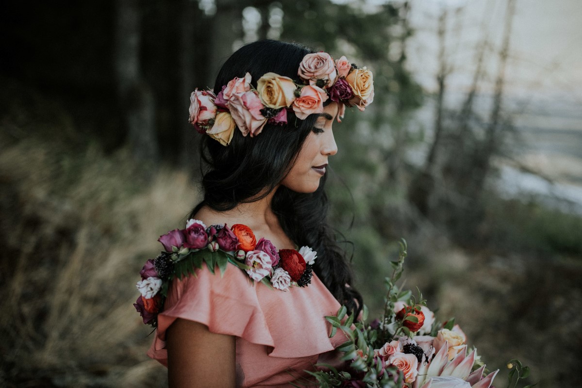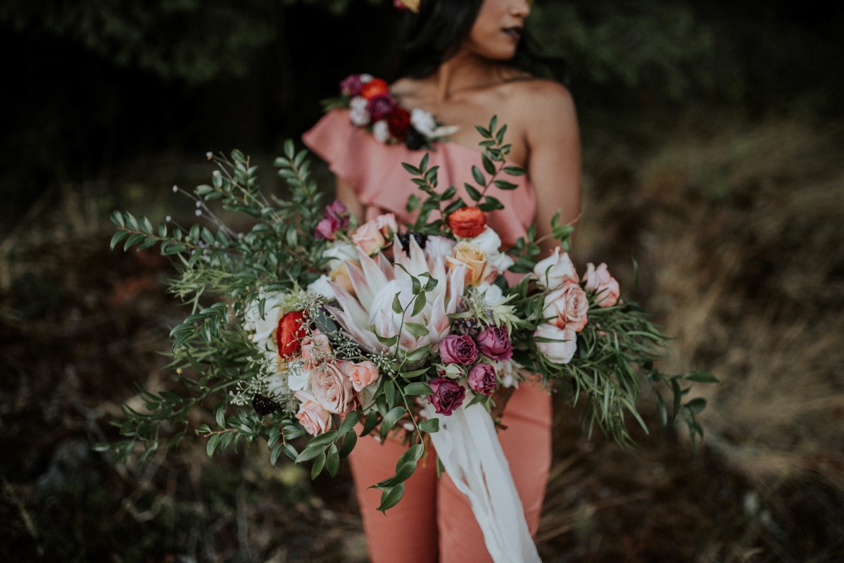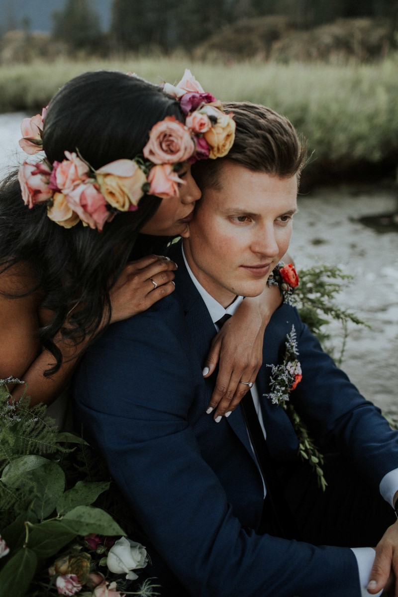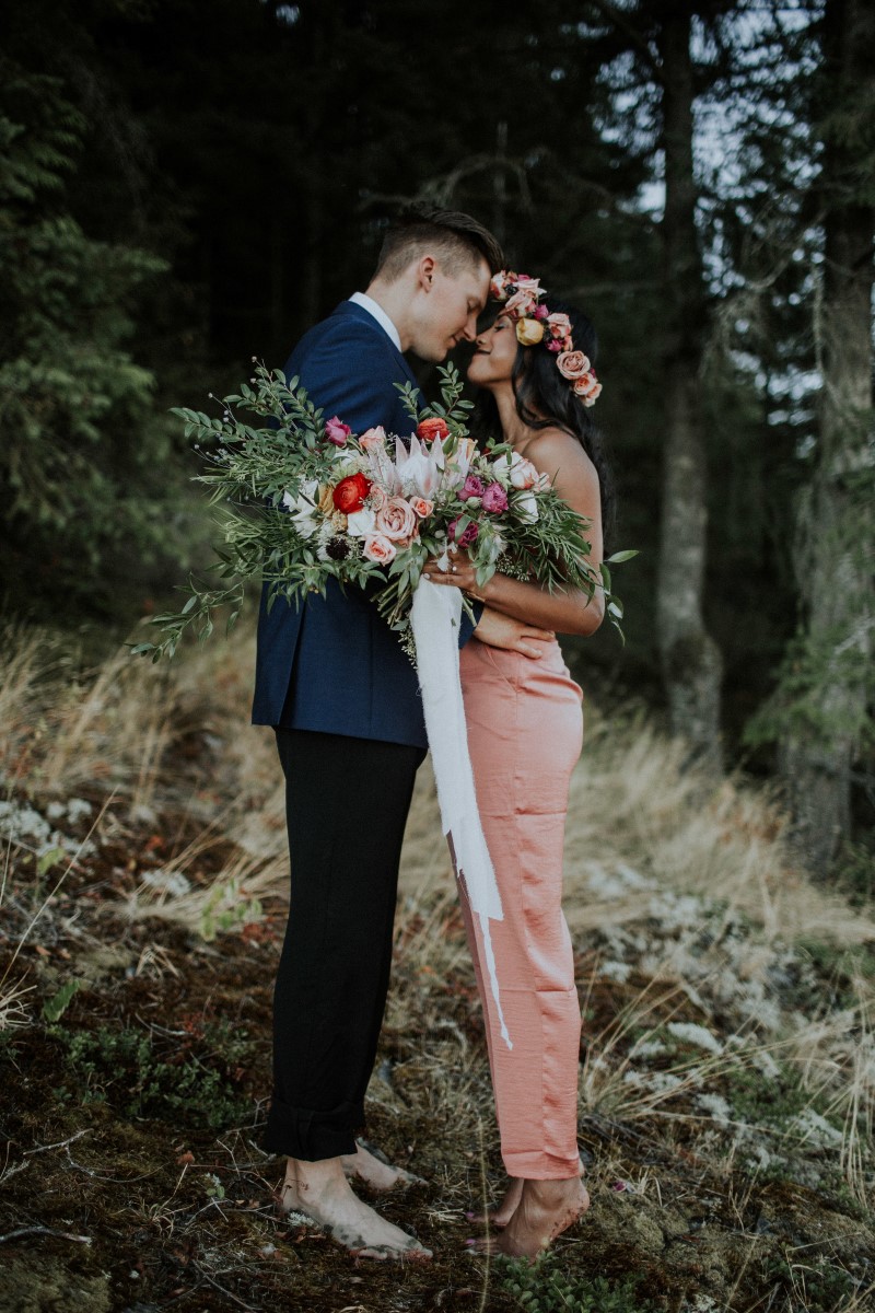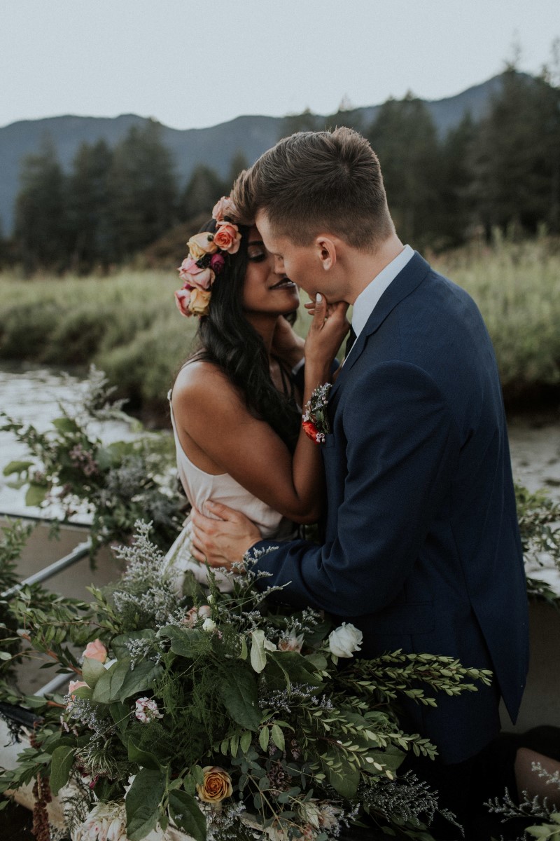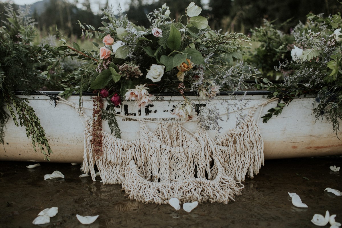The fresh color pallet complements the classic Canadian landscape of deep green forests and pale blue mountain ranges by mixing bold floral and bohemian details. Kaye Fleur designed the shoot and bedecked the models with beautiful floral details, including a wristband, shoulder corsage, floral crown, alternative pocket square, and bouquet. She also designed a lush floral piece for the couple’s canoe, which framed an intricate custom macrame design by Forage and Lace.