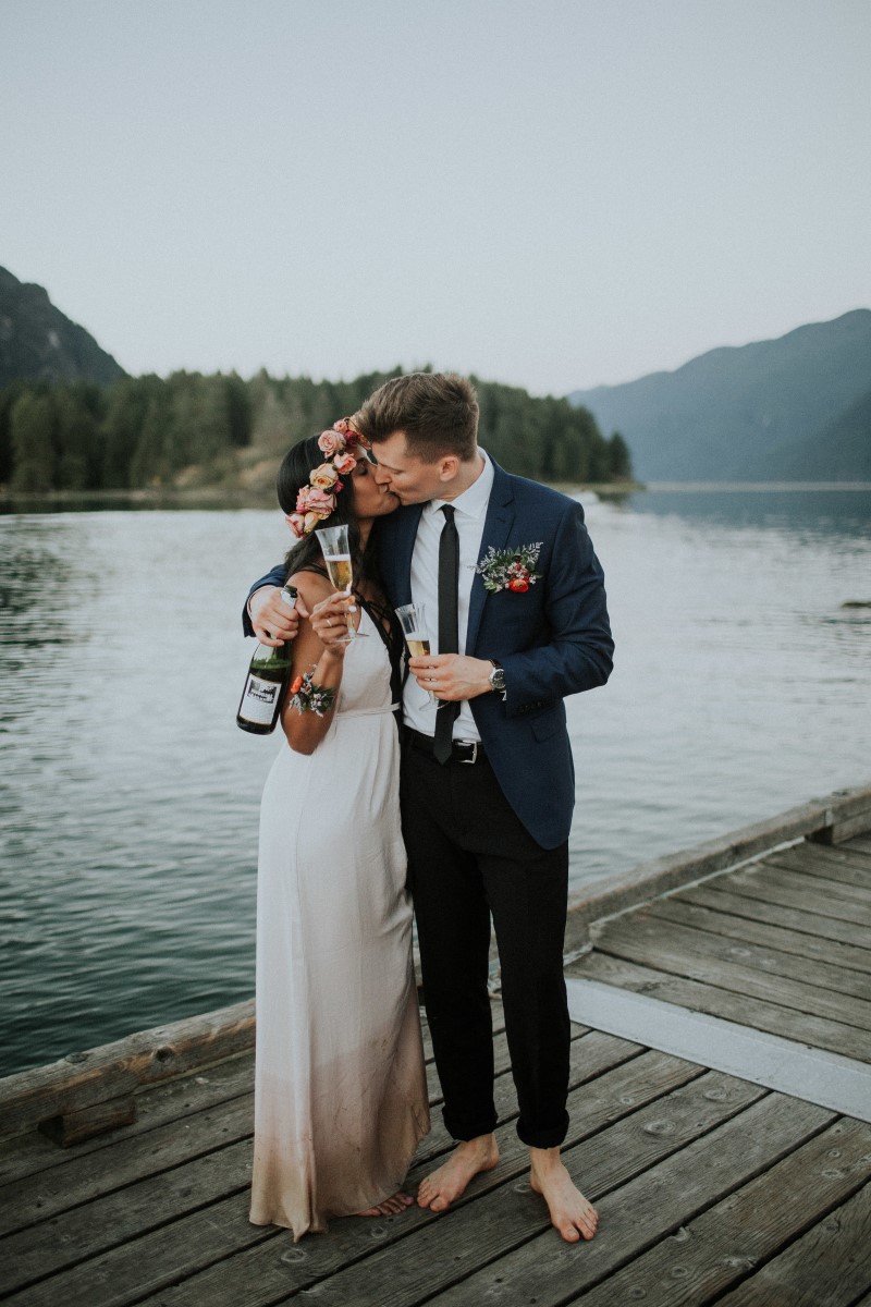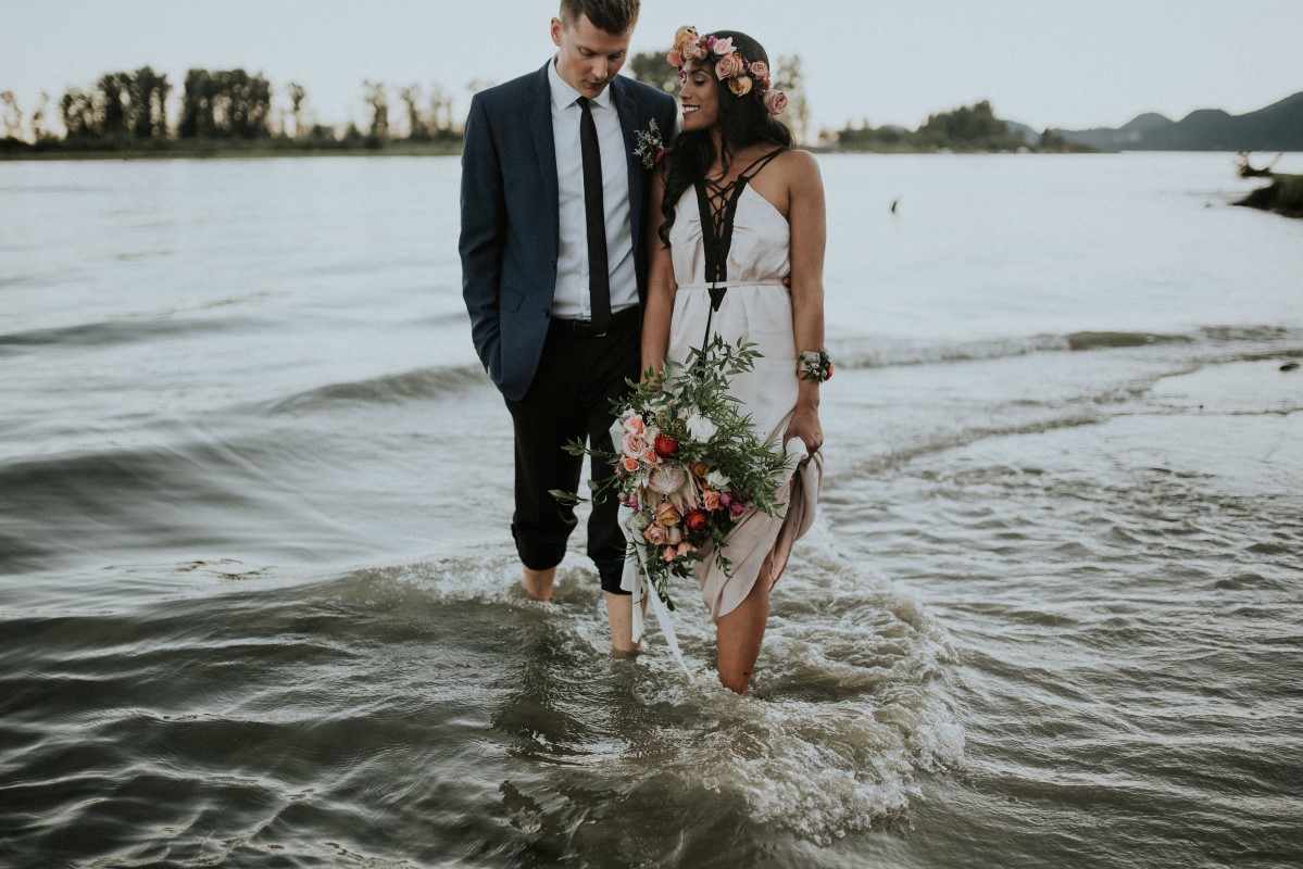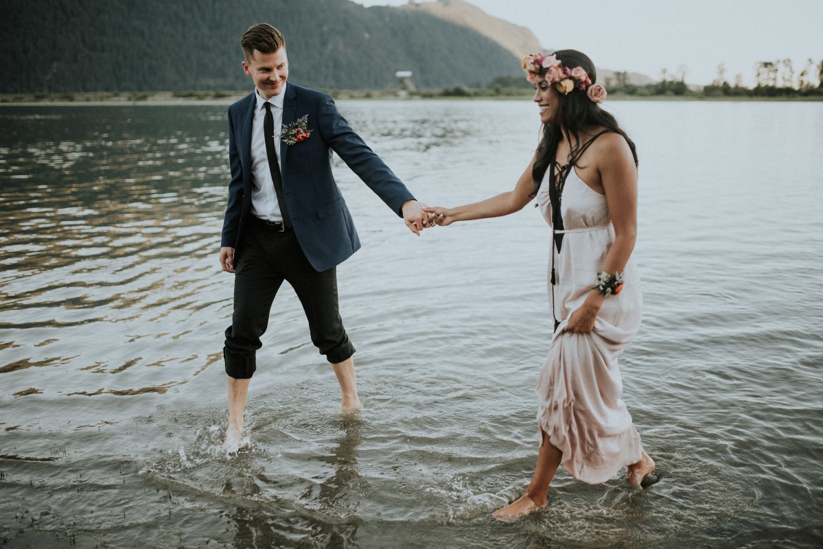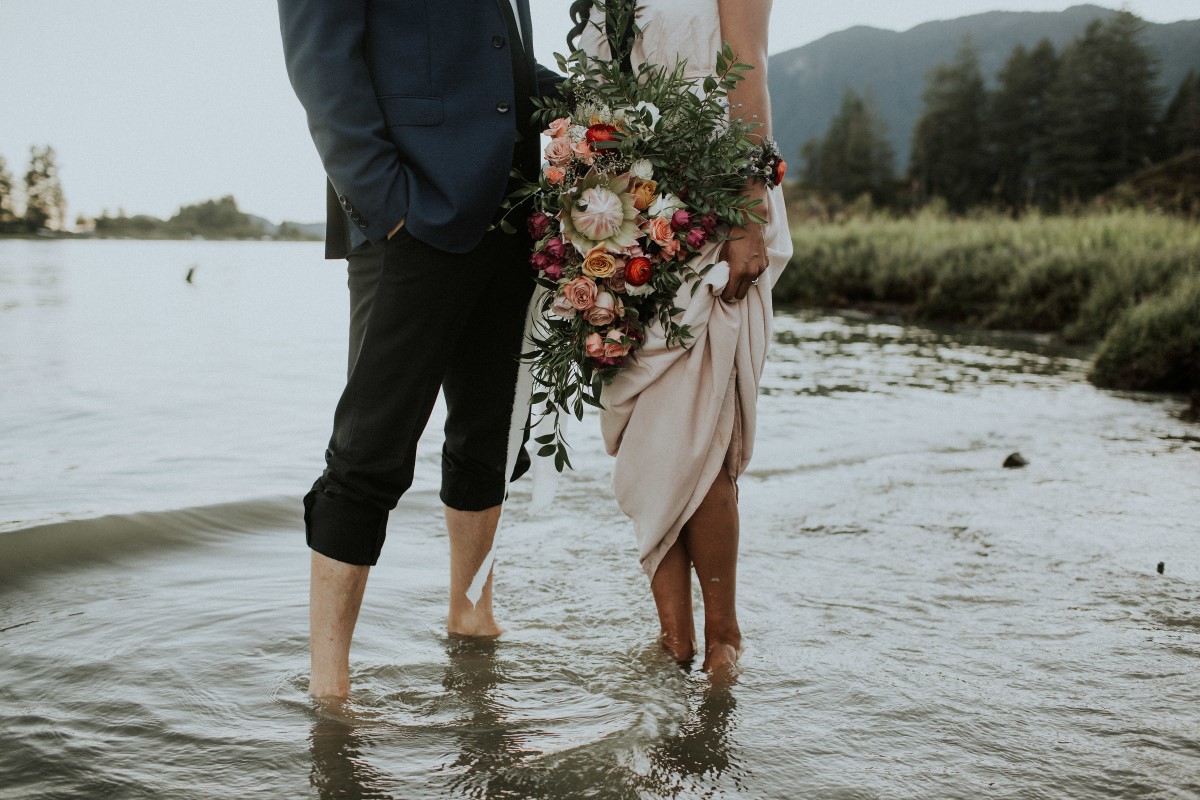 A boat filled with lush florals? A lakeside elopement? Yes, Please! This styled elopement was a collaboration between photographer Art + The Aerialist, Menze Visuals, and florist Kaye Fleur in Pitt Meadows, BC. The location, a remote sandbar on Pitt Lake, was only accessible by boat, which certainly added to the adventure!