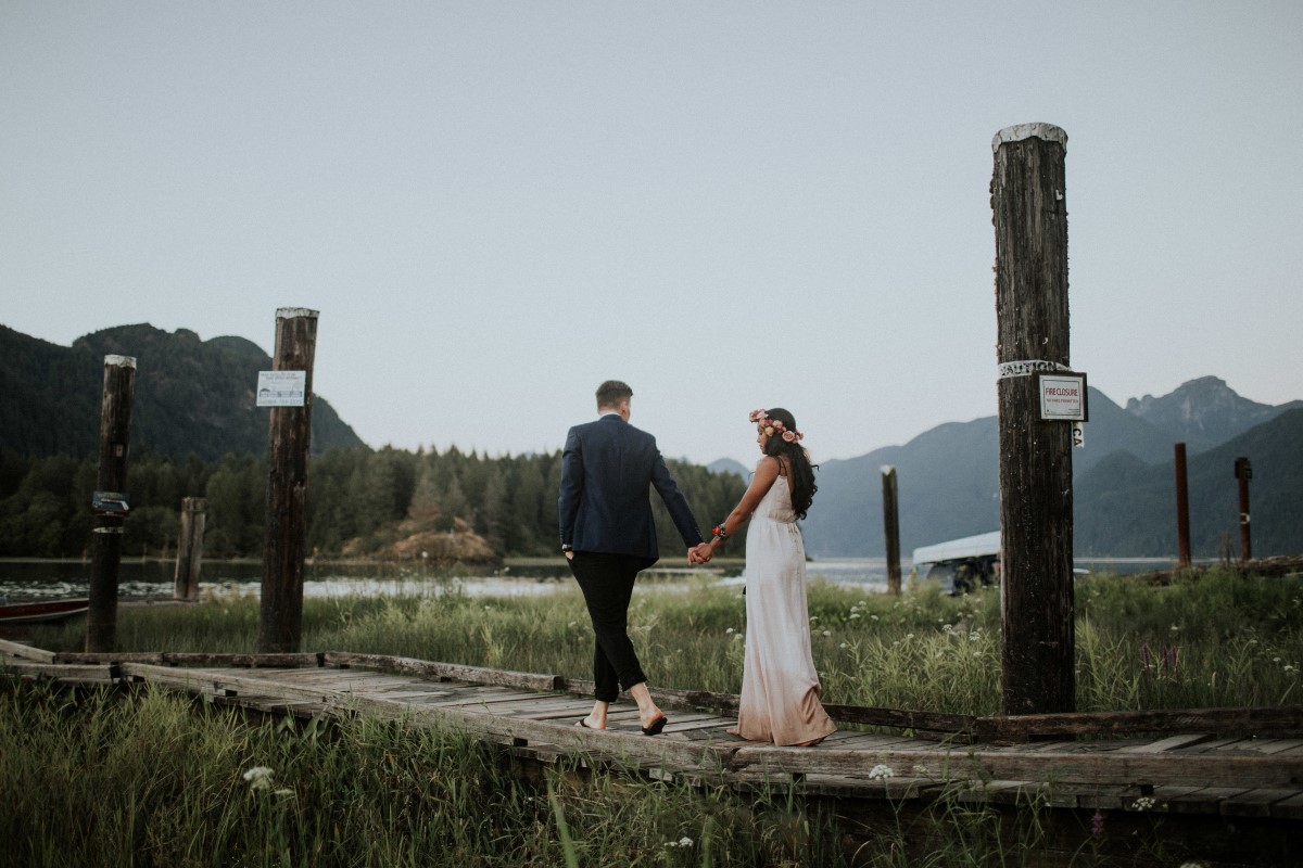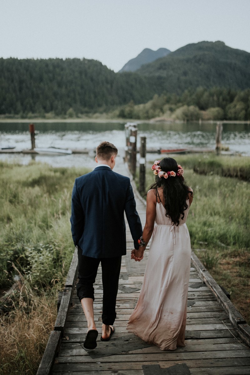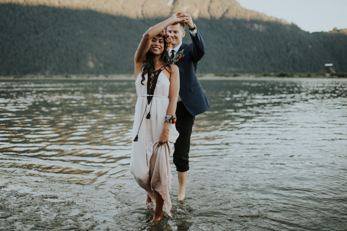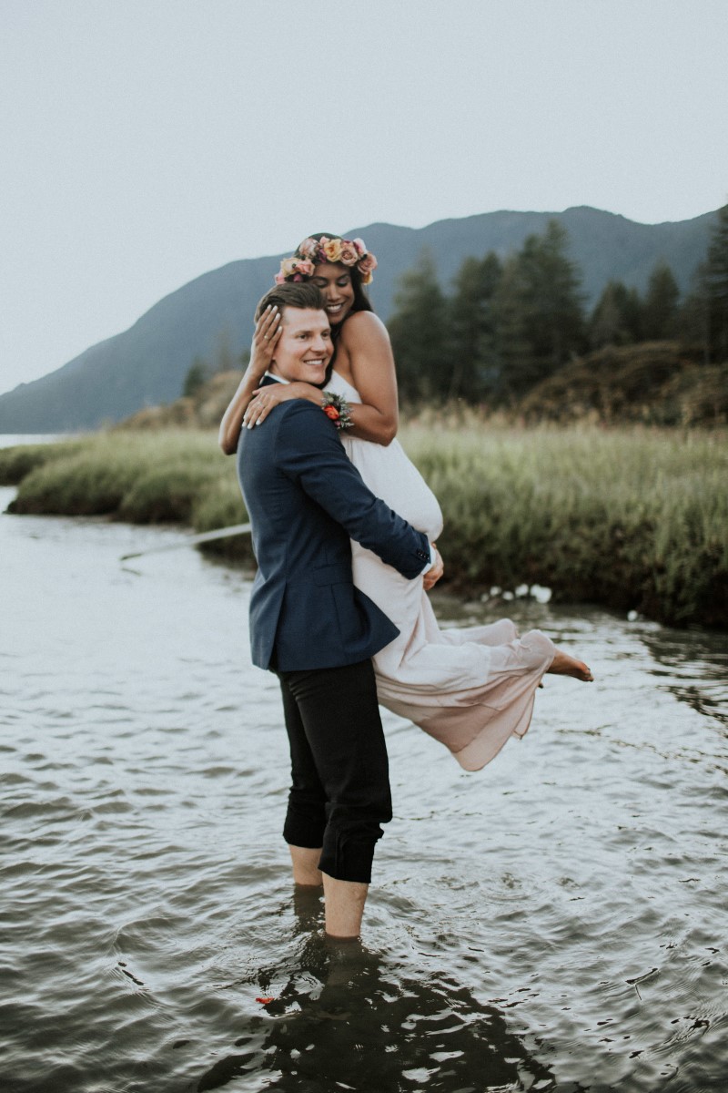 A boat filled with lush florals? A lakeside elopement? Yes, Please! This styled elopement was a collaboration between photographer Art + The Aerialist, Menze Visuals, and florist Kaye Fleur in Pitt Meadows, BC. The location, a remote sandbar on Pitt Lake, was only accessible by boat, which certainly added to the adventure!