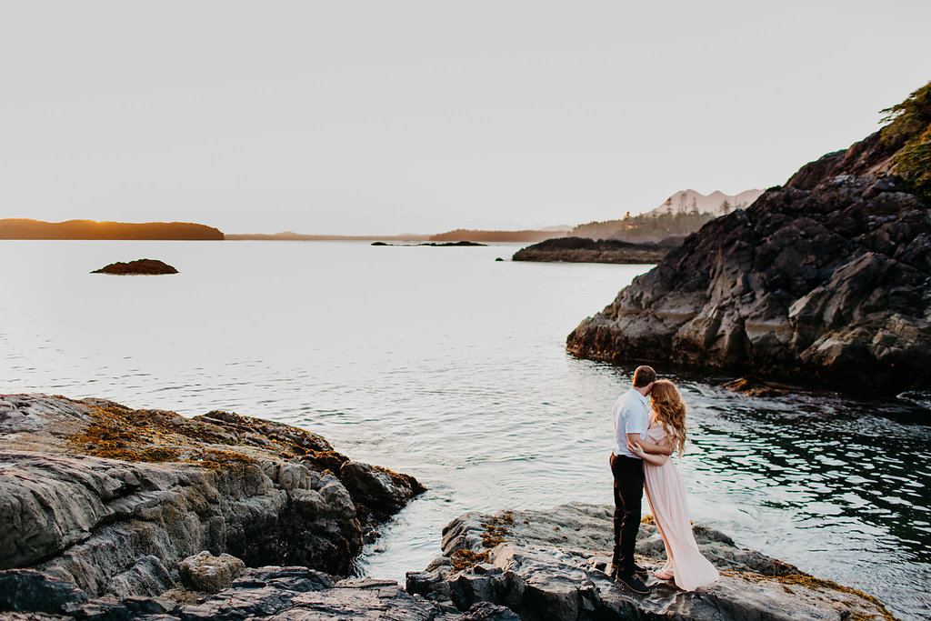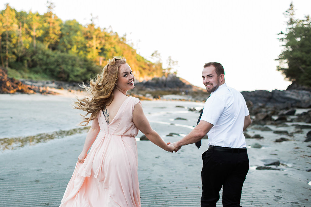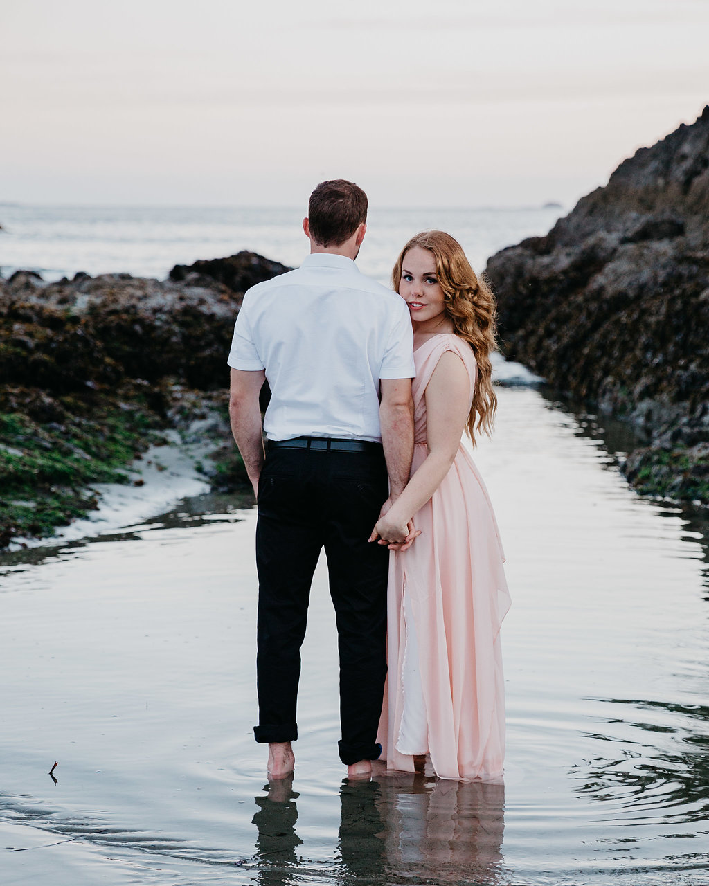We love the colour of the gown, the gorgeous bride…oh, and the incredible sunset! The West Coast not only has some of the most beautiful vistas in the world, but it can also surprise by providing a stunning Tofino wedding sunset for lucky couples willing to wander through the evening tide.