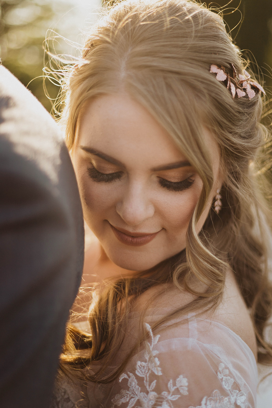 Ruby found her lace, form fitting gown with train and veil in Victoria and chose to have gorgeous tropical flowers in her bouquet and reception flowers. Burgundy calla lilies and orchids along with blush pink and white roses created a bold floral design which carried through the reception decor. We loved the hair crown which was placed at the back of the bride’s spectacular braided and loosely curled hair. Her bridesmaid complemented in a burgundy, full length gown and flowers in her hair. This wedding featured quite the stylish groom who wore a blue grey dinner jacket with black lapels and black bow tie.