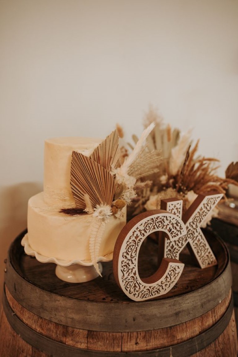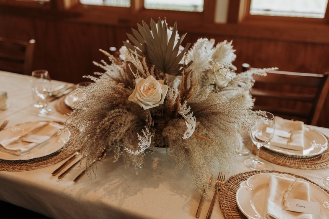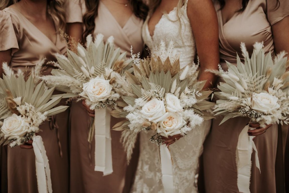 Caitlyn chose a unique floral design (thank you, Pinterest!). Dried palm branches, pampas grass, foxtails, and fresh roses were paired with dried grasses and finished with flowing blush silk ribbons. The simplicity is an illusion as each bouquet is fashioned onto a surface design, and the fresh roses meant it was down to the last minute. It was worth it, as the bouquets were gorgeous and extraordinary!