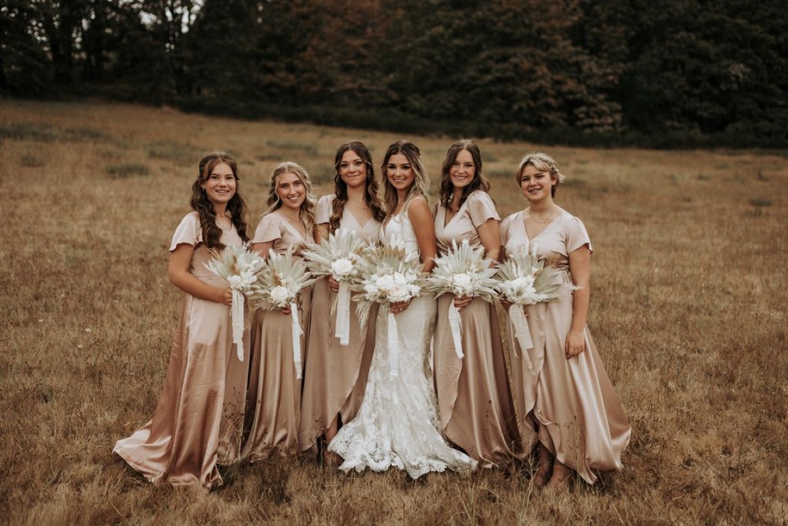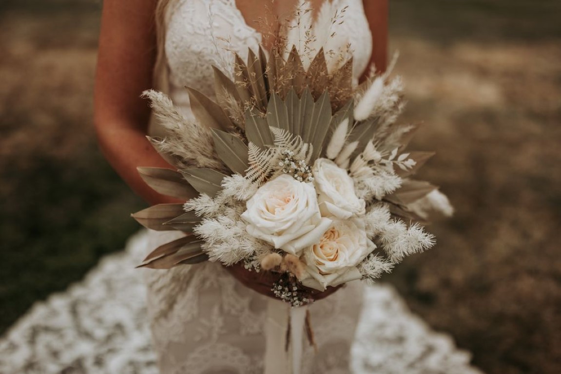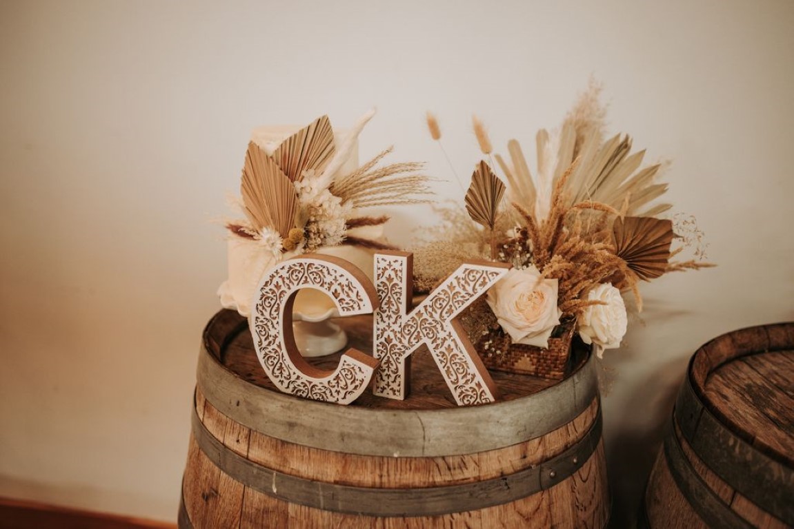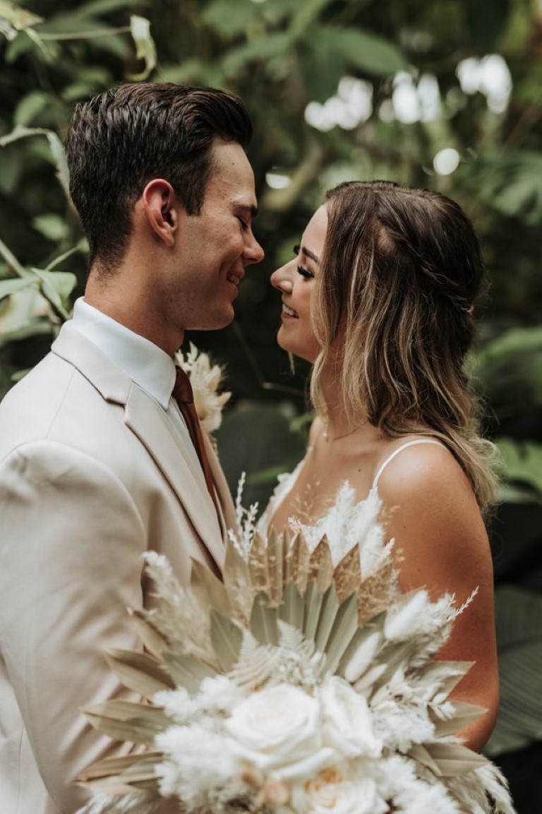 Caitlyn chose a unique floral design (thank you, Pinterest!). Dried palm branches, pampas grass, foxtails, and fresh roses were paired with dried grasses and finished with flowing blush silk ribbons. The simplicity is an illusion as each bouquet is fashioned onto a surface design, and the fresh roses meant it was down to the last minute. It was worth it, as the bouquets were gorgeous and extraordinary!
