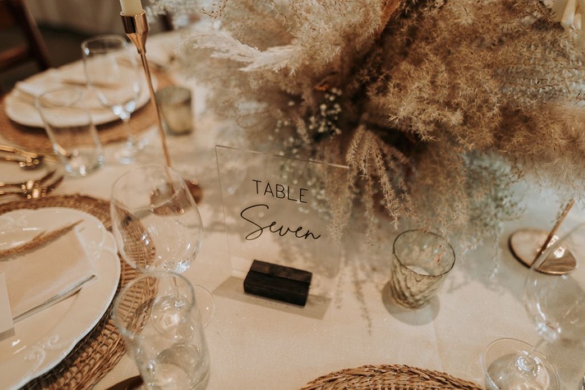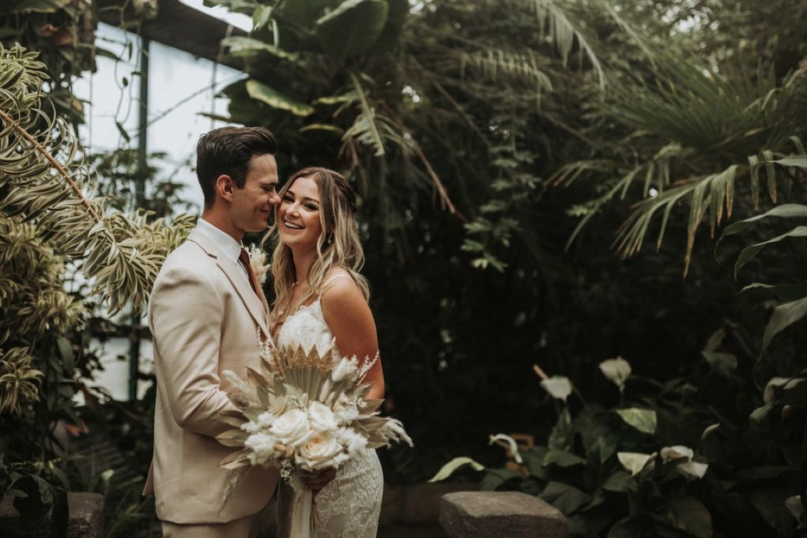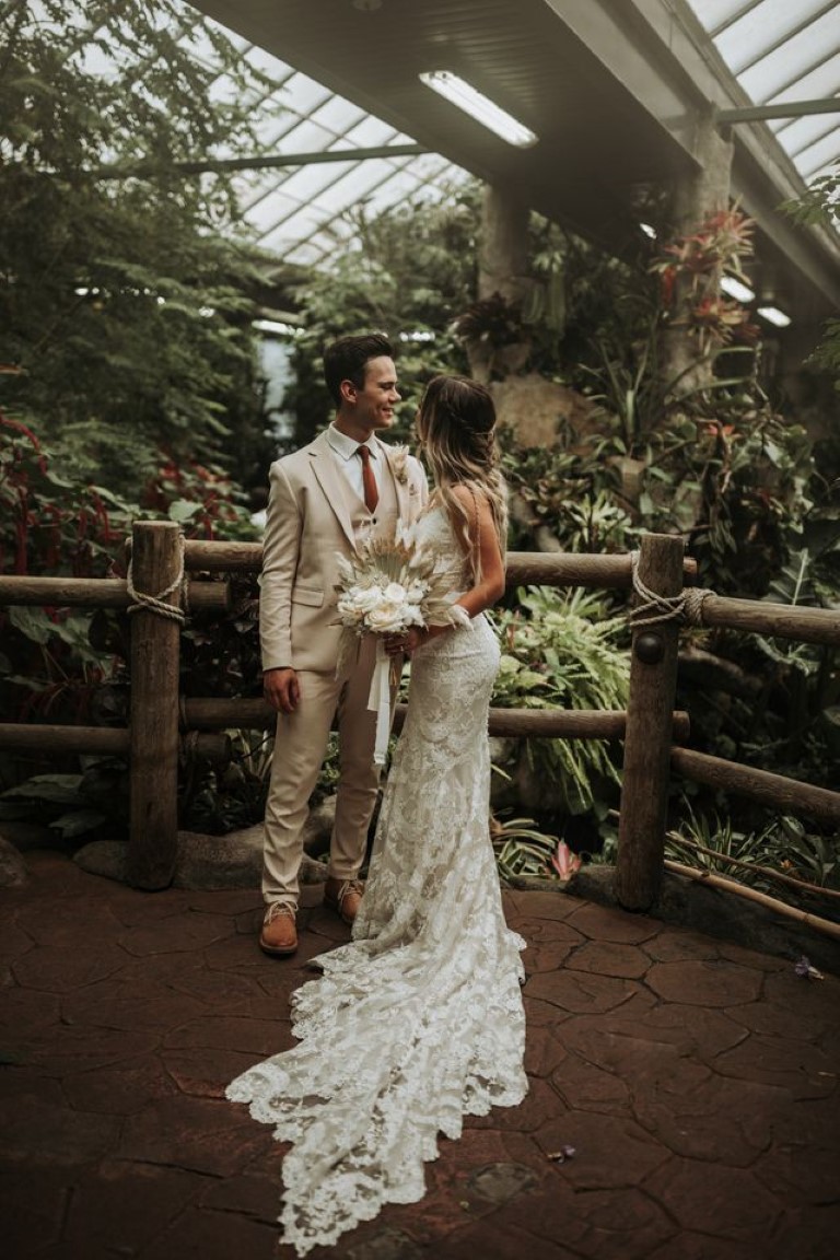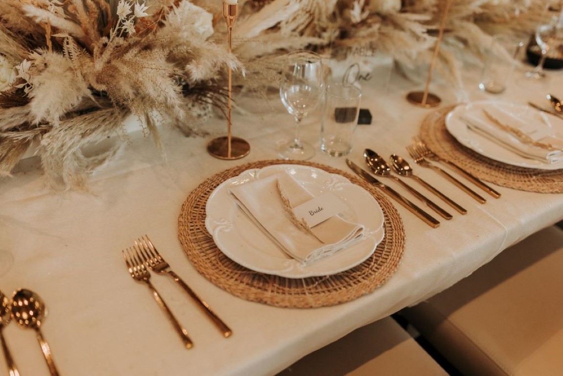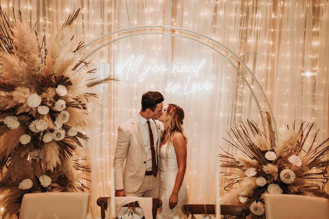 The newlyweds chose to have a photo session at the nearby Butterfly Gardens before the full-course meal with a harmonious wine pairing. The decor theme was carried onto the tables with dried grass and white rose arrangements surrounded by trendy gold candle holders, wicker charger plates, perfectly matched scalloped-edged plates, linen napkins, gold cutlery, and lovely name placeholders. Even the boho table linens were in the game, featuring tiny gold threads that shone in the candlelight. We love that the bride and groom sat in front of a playful LED light sign saying, ‘All you need is love,’ lit by a twinkle drapery backdrop. Korbin and Caitlyn’s dreams came to life around them, and they couldn’t have been happier.