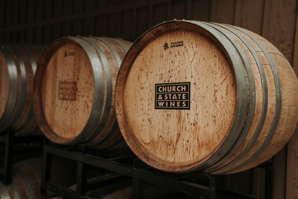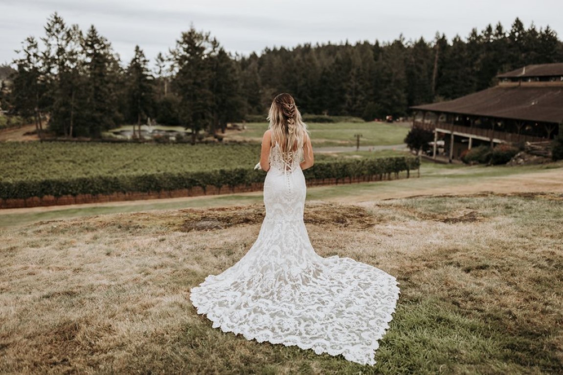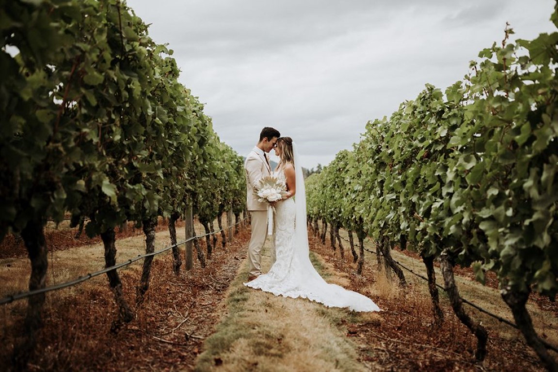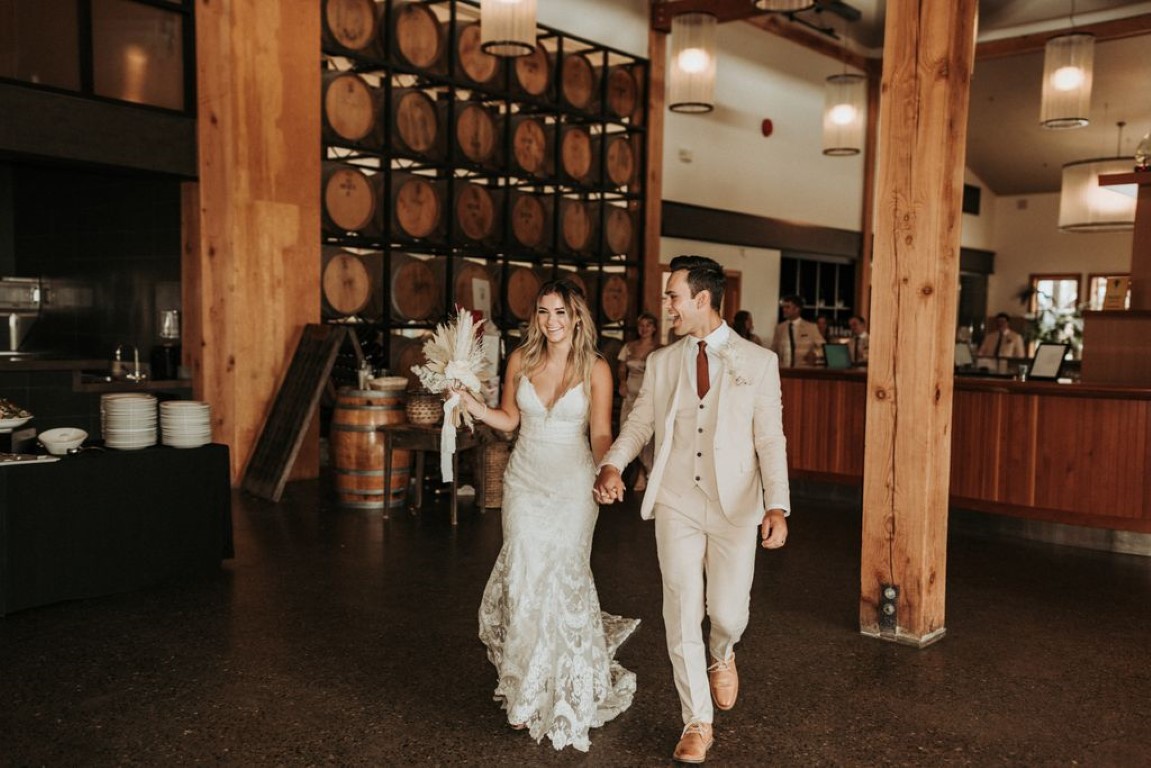 Newlyweds walk through Church and State Winery on Vancouver Island