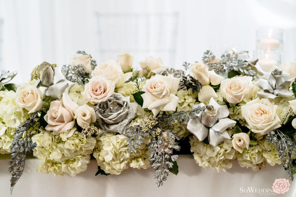 Head Table floral edge of white roses, silver and blue by ProLine Trading in Vancouver